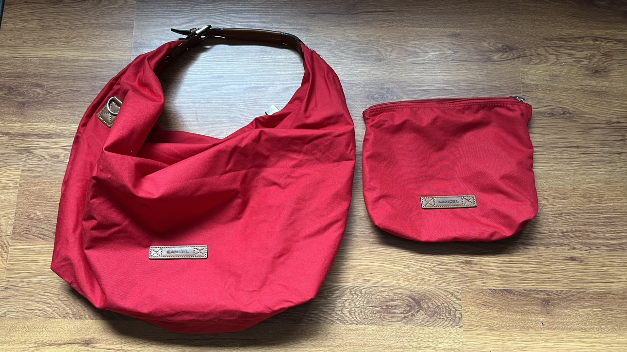 This is a Lancel bag in red. It has a detachable shoulder strap and a small zippered pouch. It is in good condition and has no rips or tears. It has some wear and tear. It has been used gently. There is a tiny mark on the front that is not easily noticeable. The shoulder strap is adjustable. It is a great everyday bag. It would be a great gift for any fashion enthusiast.