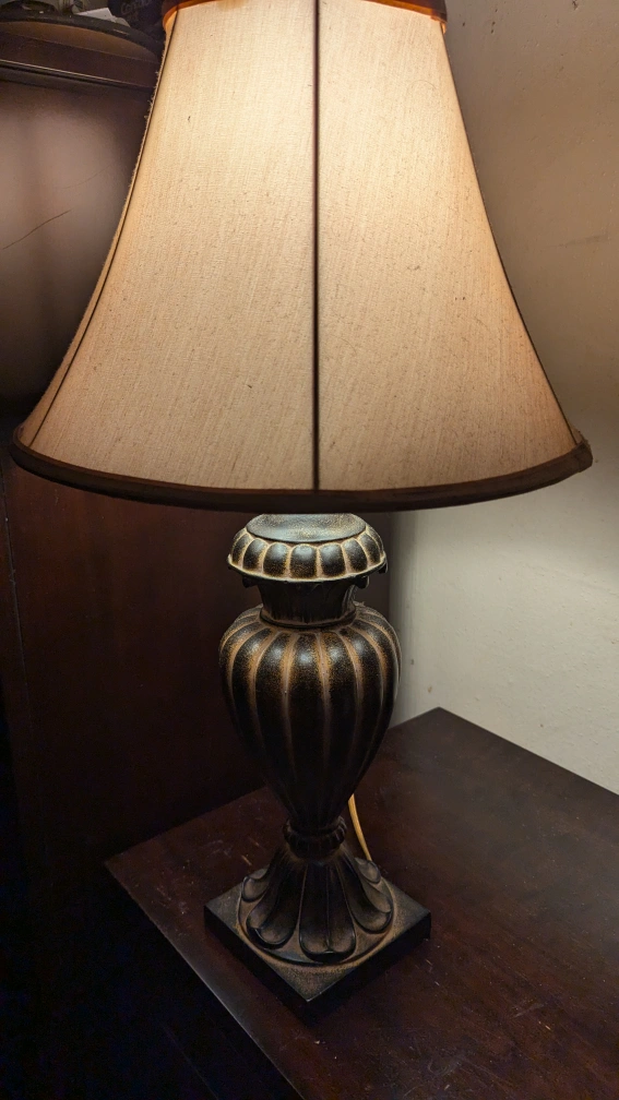 Lamp with a beige lampshade and an ornate base. The base is dark brown with gold accents. The lamp is in good condition. The lamp is approximately 18" tall.
