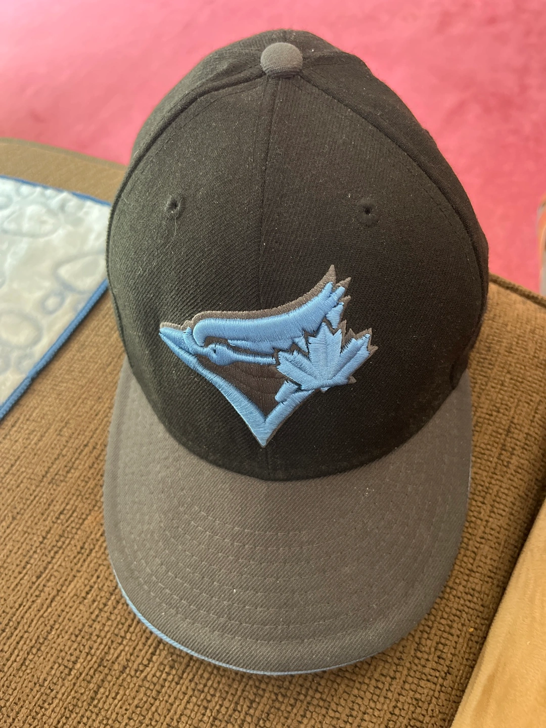 Giving away this black New Era hat with the Toronto Blue Jays logo on the front. The hat has a grey brim with a blue edge. The hat size is 7 3/8. The hat is in good condition.