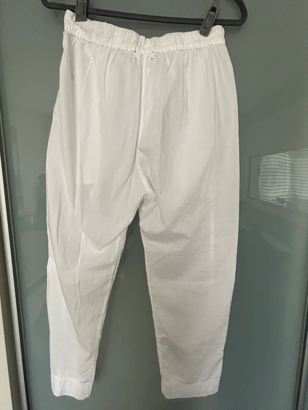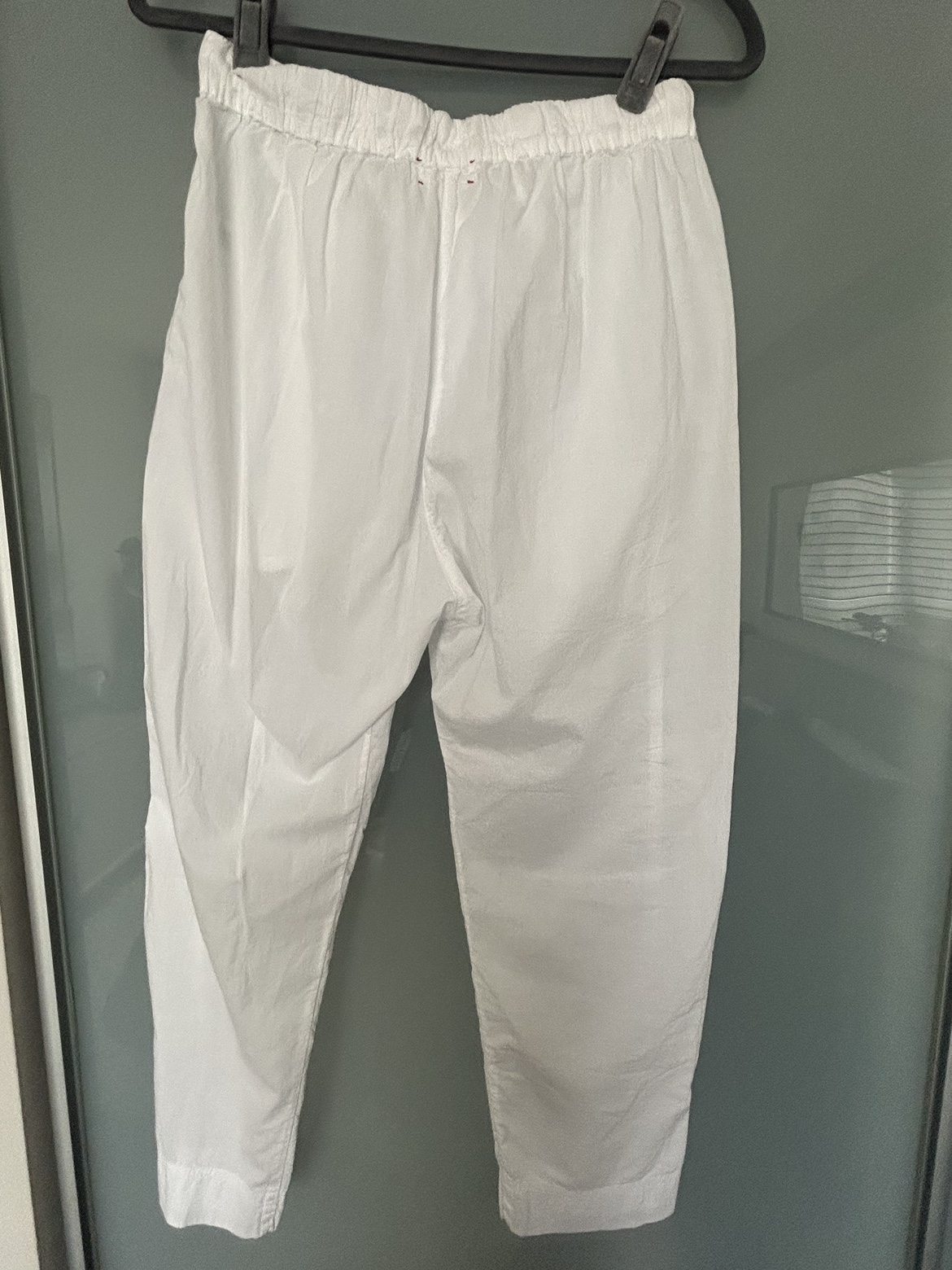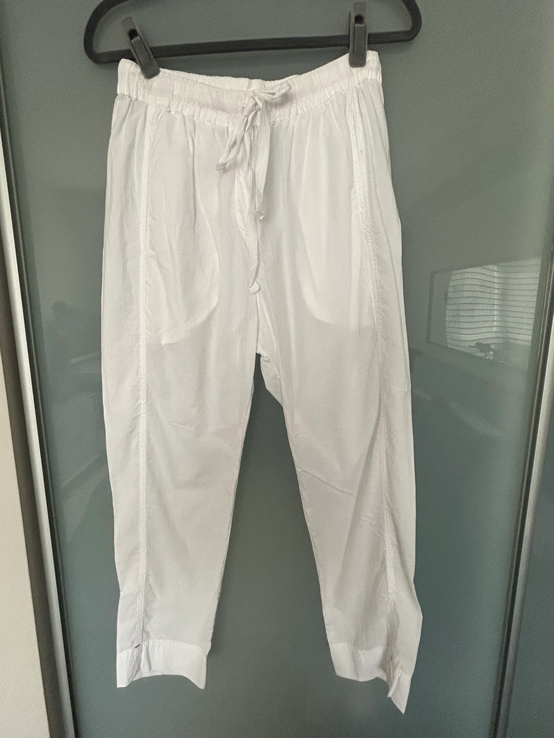 10White cropped pants with a drawstring waistband and side pockets. The pants are made of a lightweight fabric and are perfect for the warmer months. 100% cotton