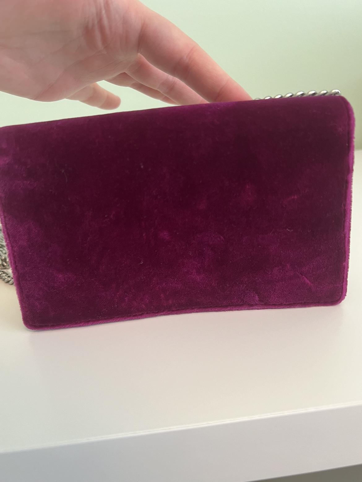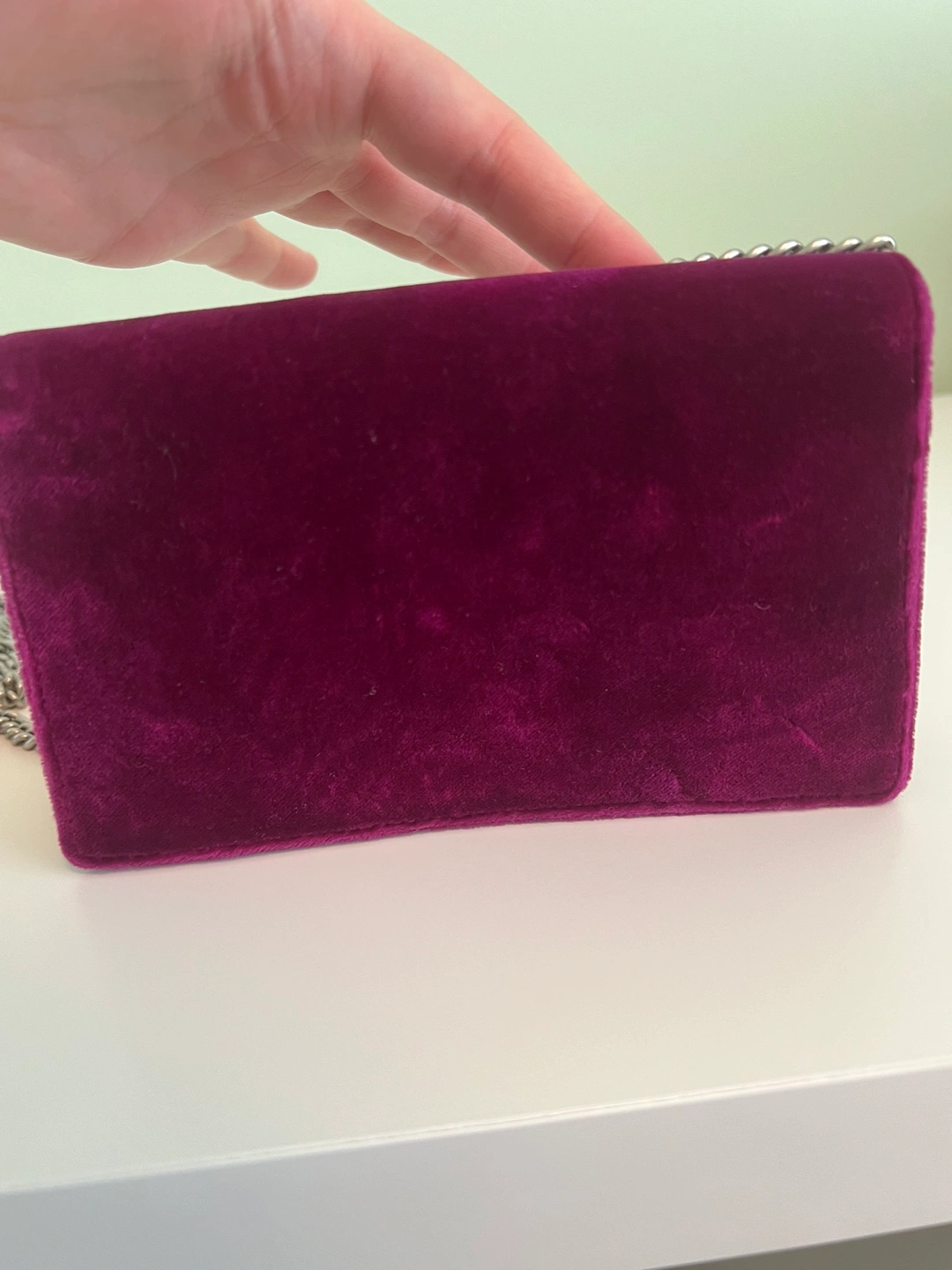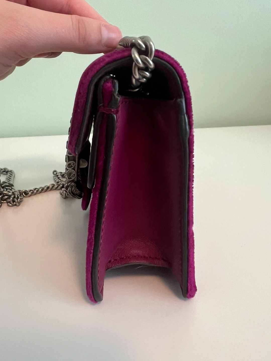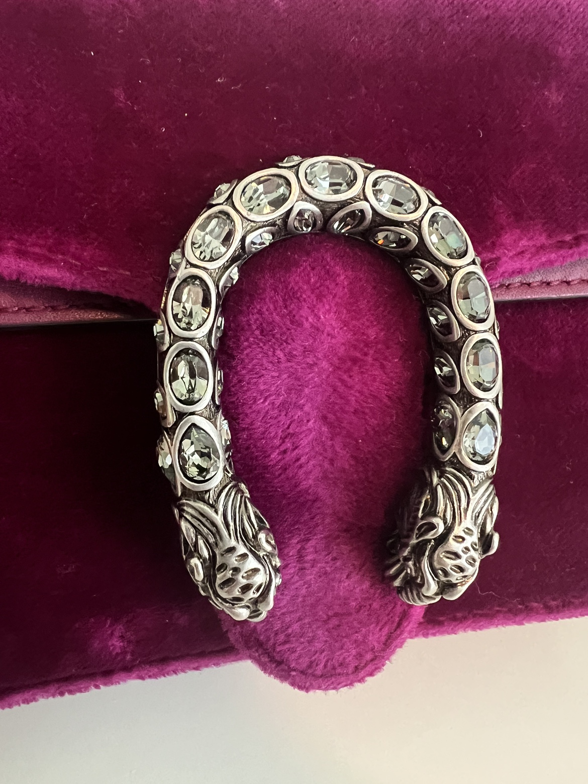 Small velvet Dionysus Gucci bag with a silver chain strap and a large horseshoe-shaped clasp. It is in fair condition due to the marks on the velvet (please see pictures). Gems on clasp are intact and the leather is great.
