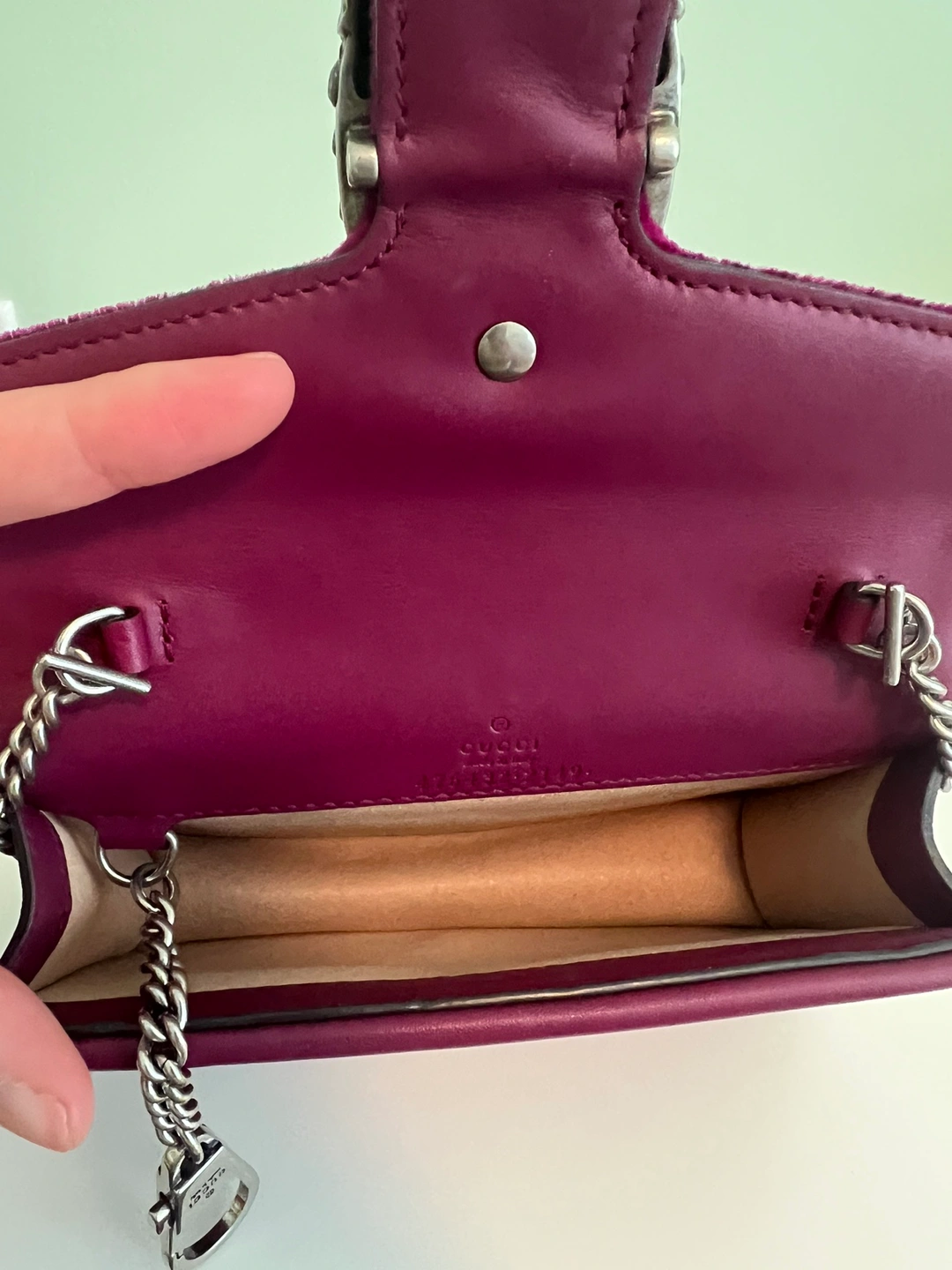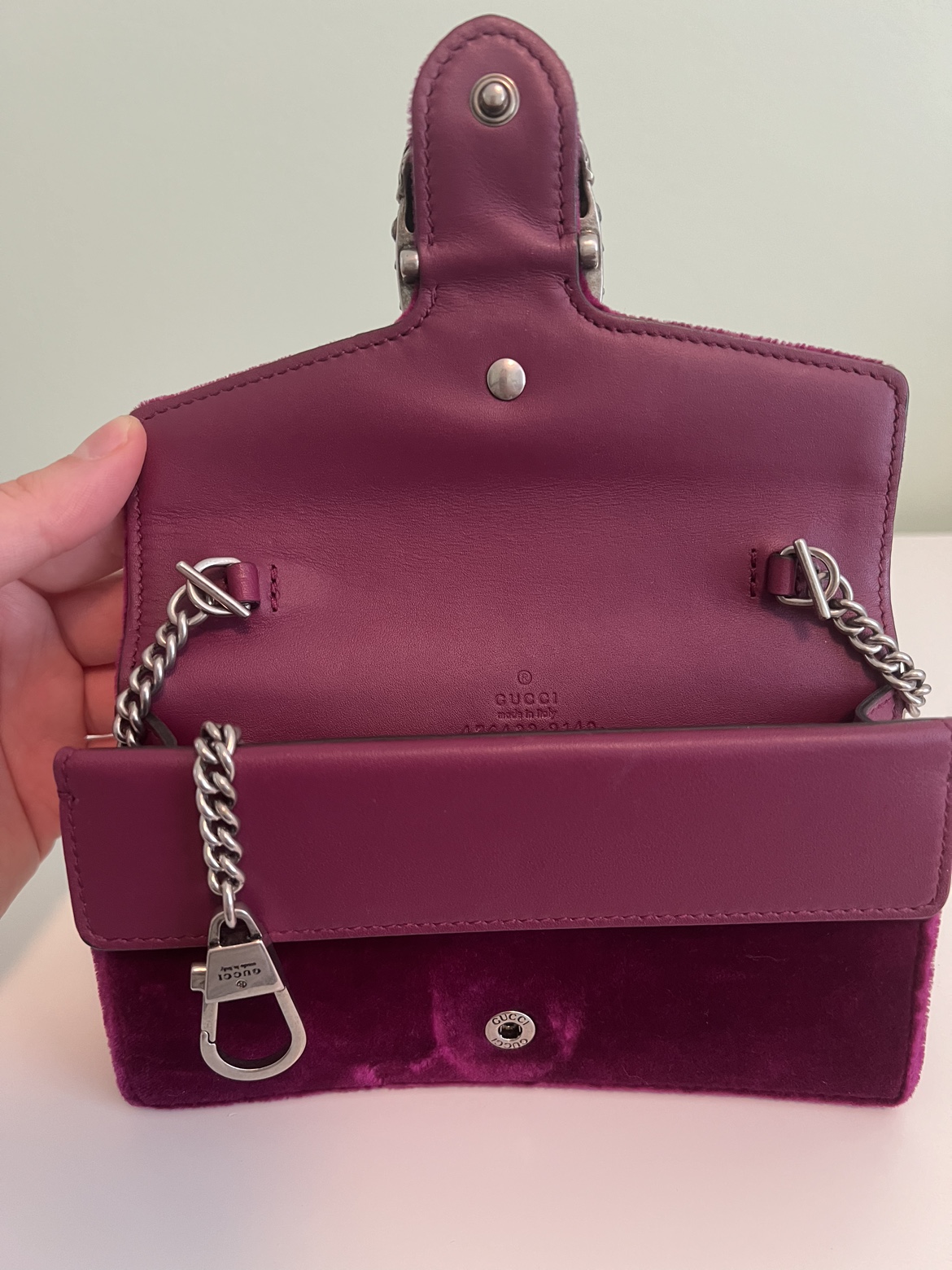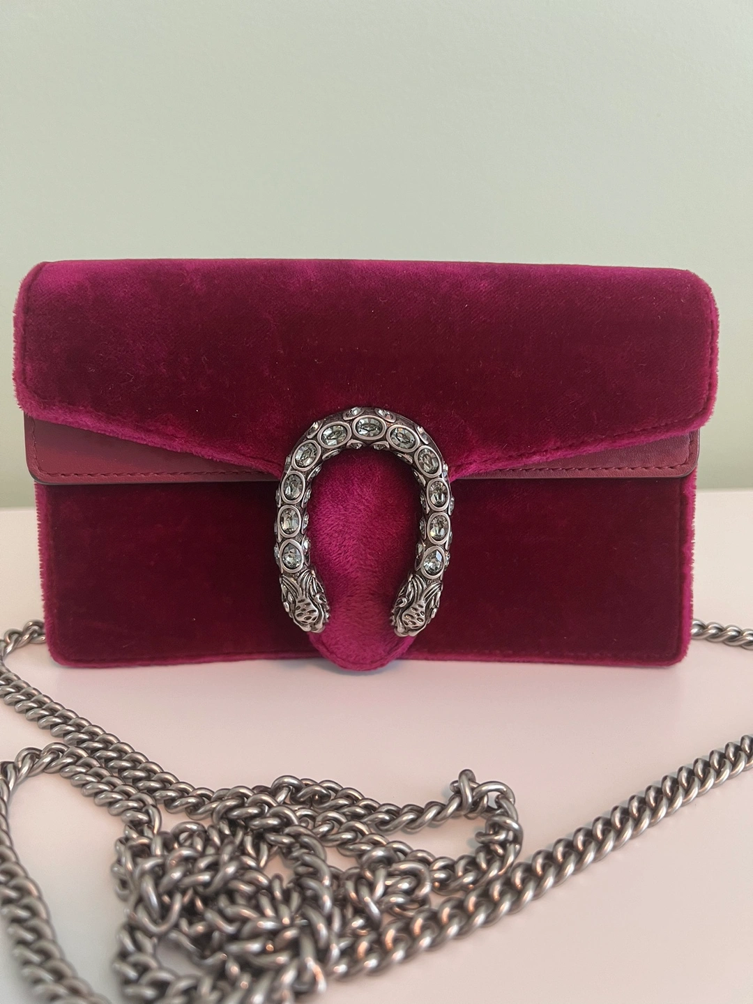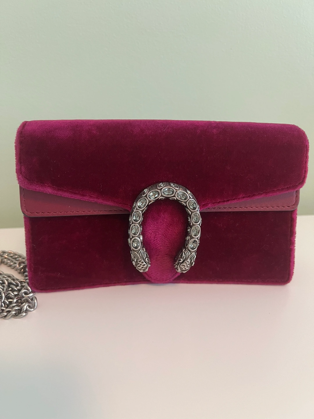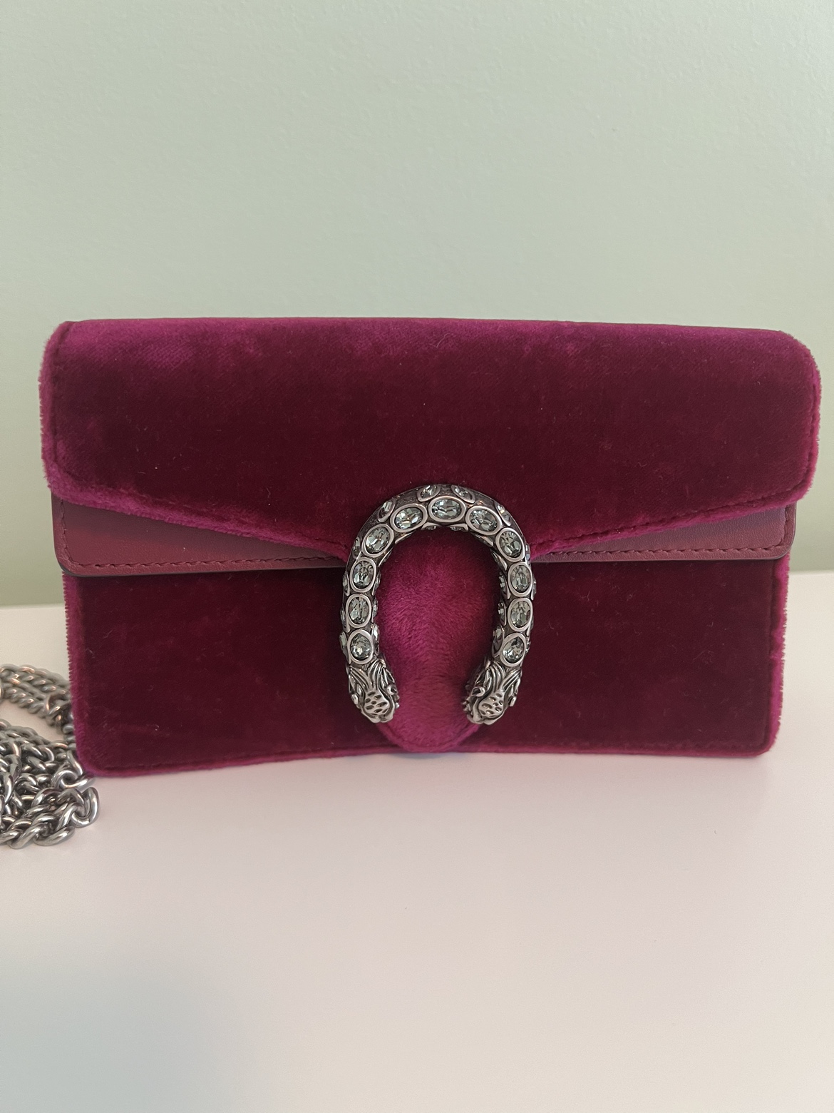 Small velvet Dionysus Gucci bag with a silver chain strap and a large horseshoe-shaped clasp. It is in fair condition due to the marks on the velvet (please see pictures). Gems on clasp are intact and the leather is great.