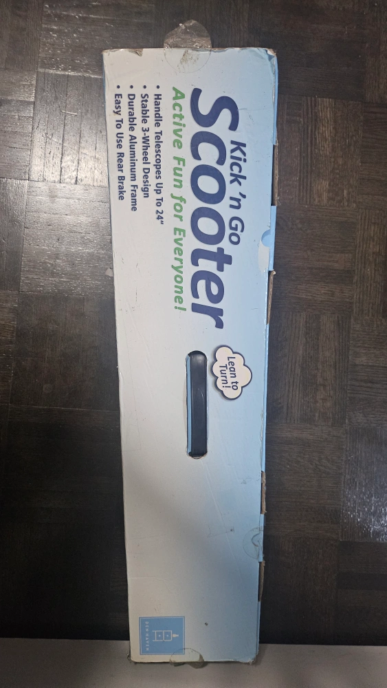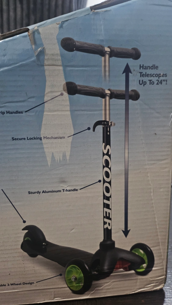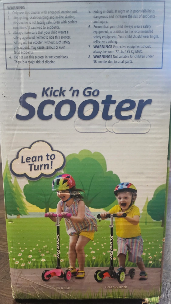A Kick'n Go scooter with adjustable handlebars. It is green and black in colour and has three wheels. The scooter features a secure locking mechanism, a sturdy aluminum T-handle, and grip handles.