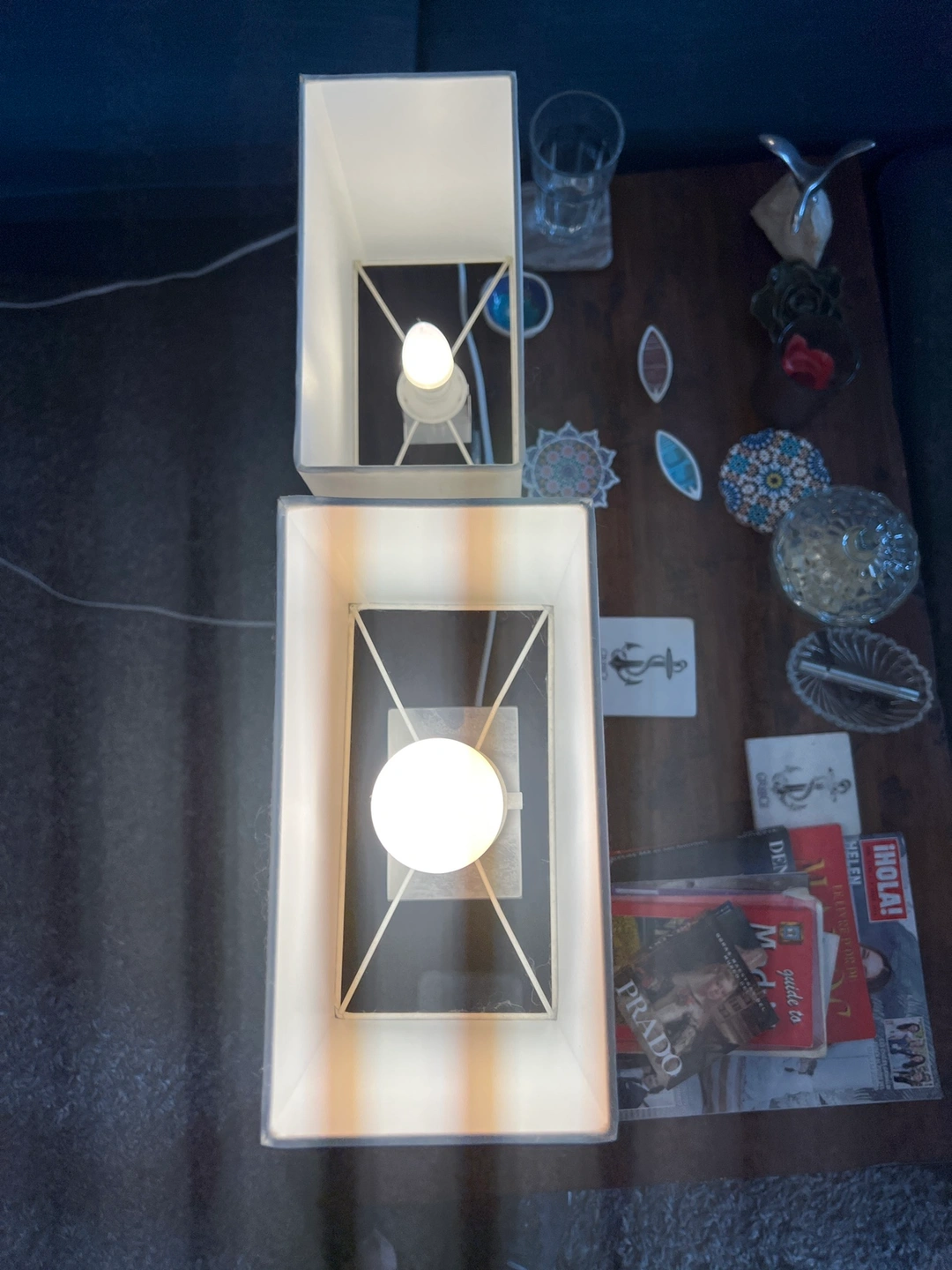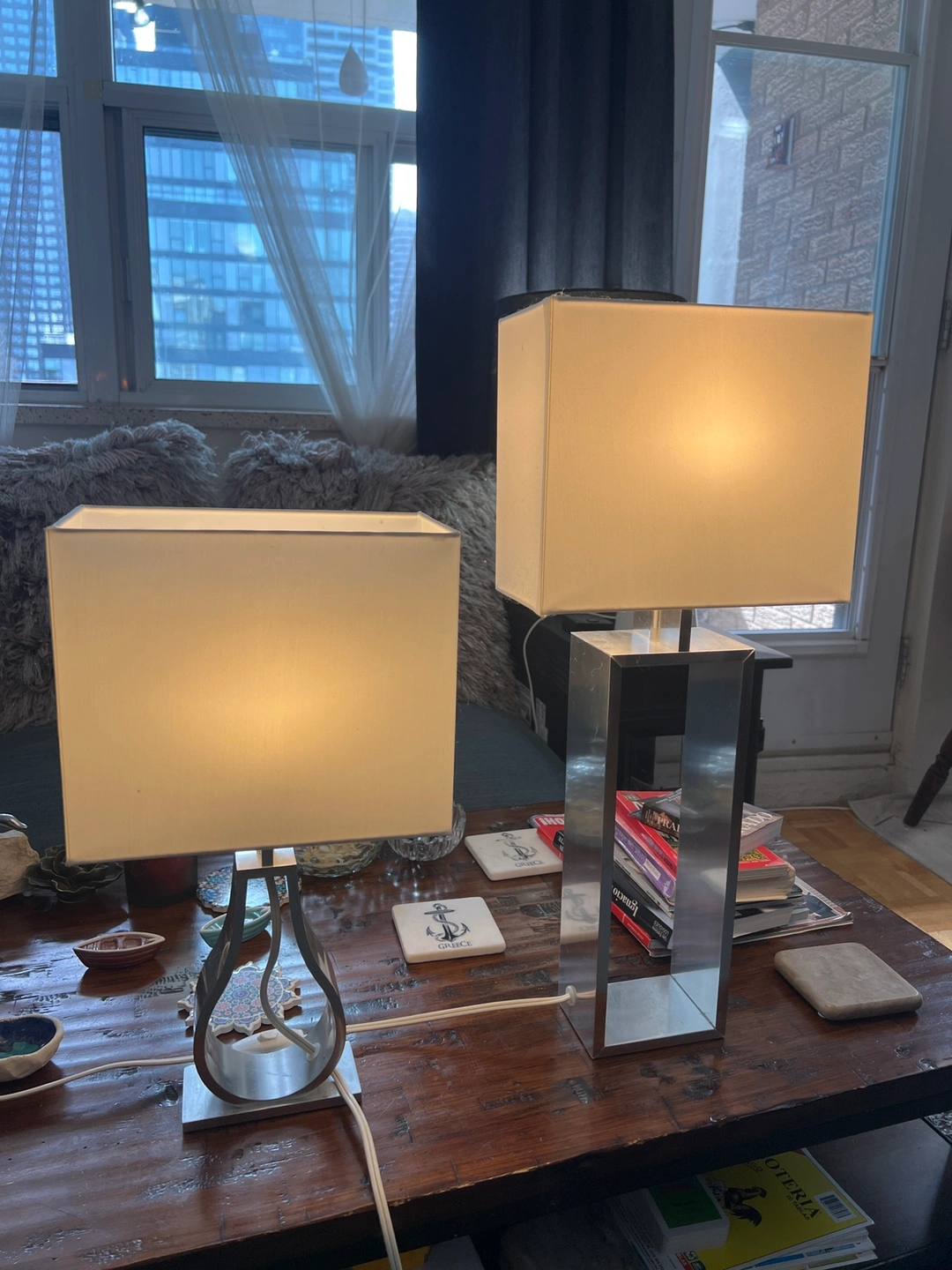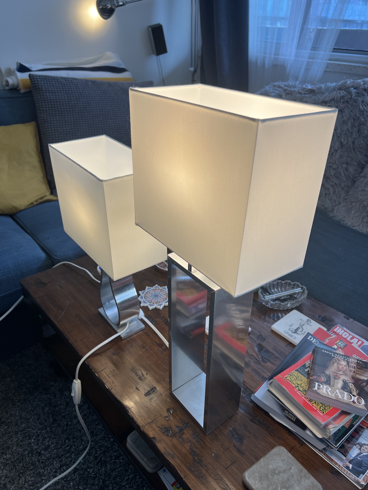 These are modern table lamps with silver coloured bases and white lampshades. They have a sleek contemporary style and are perfect for adding a touch of elegance to any room.