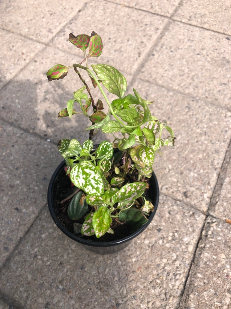 A polka dot plant in a black pot. Need more sun that I can not provide as plants need, hope find good home.
