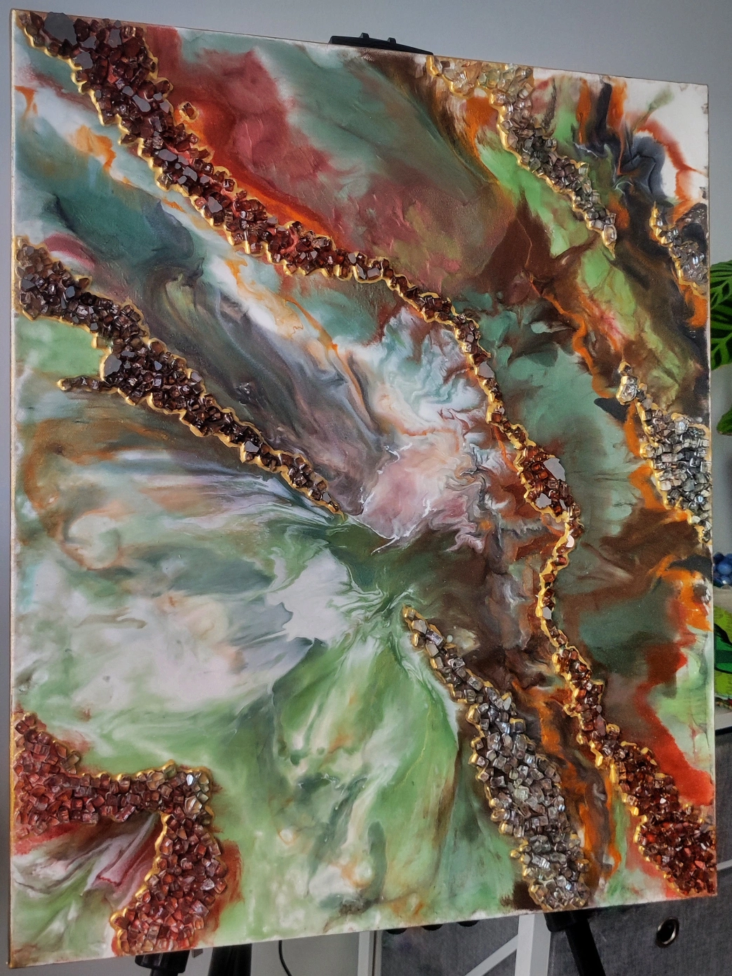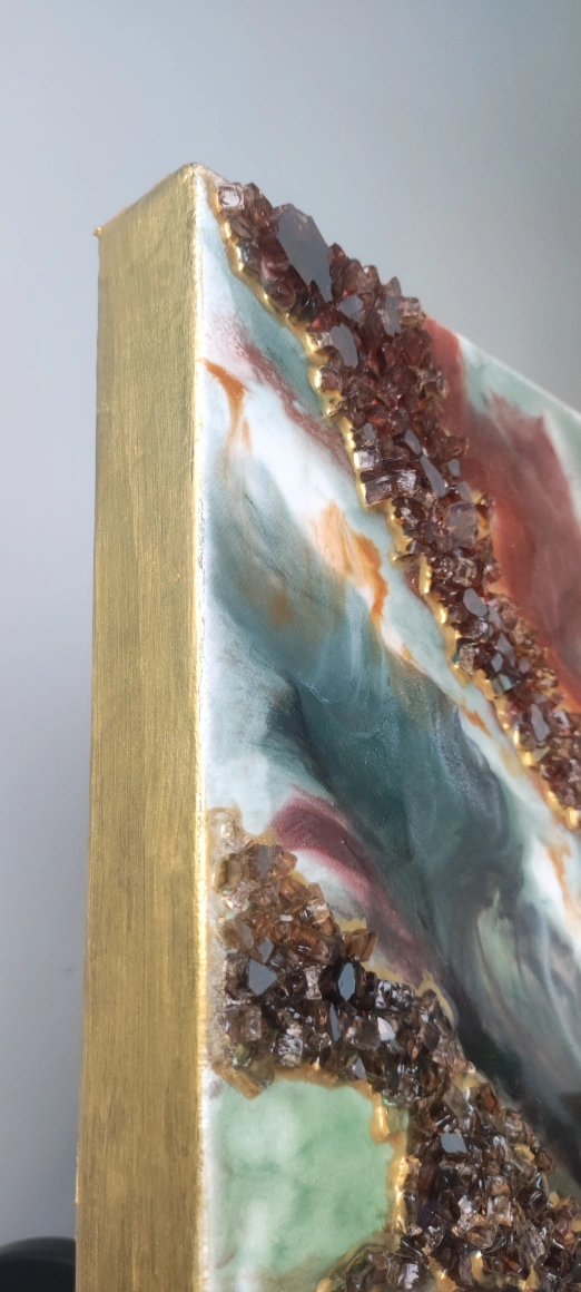 This is a beautiful, abstract resin art painting with a green, brown and gold colour scheme. The painting is very textured and eye-catching, and would look great in any modern home.the painting is made of epoxy resin