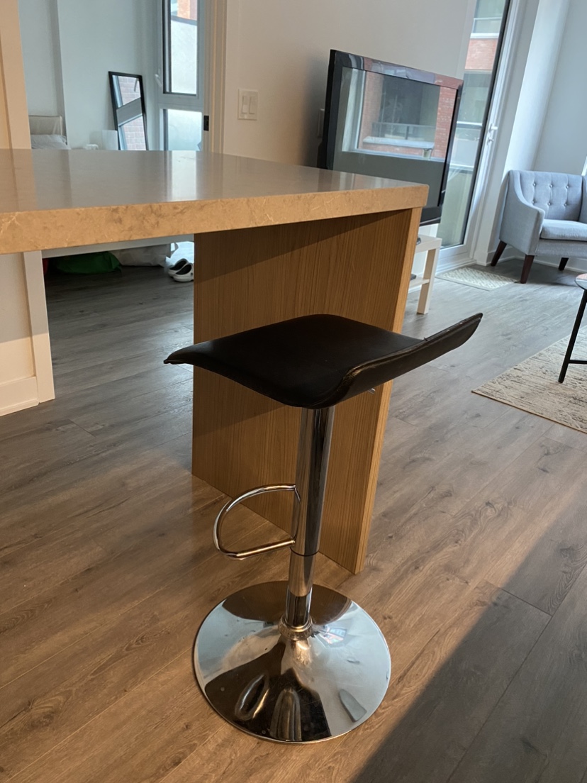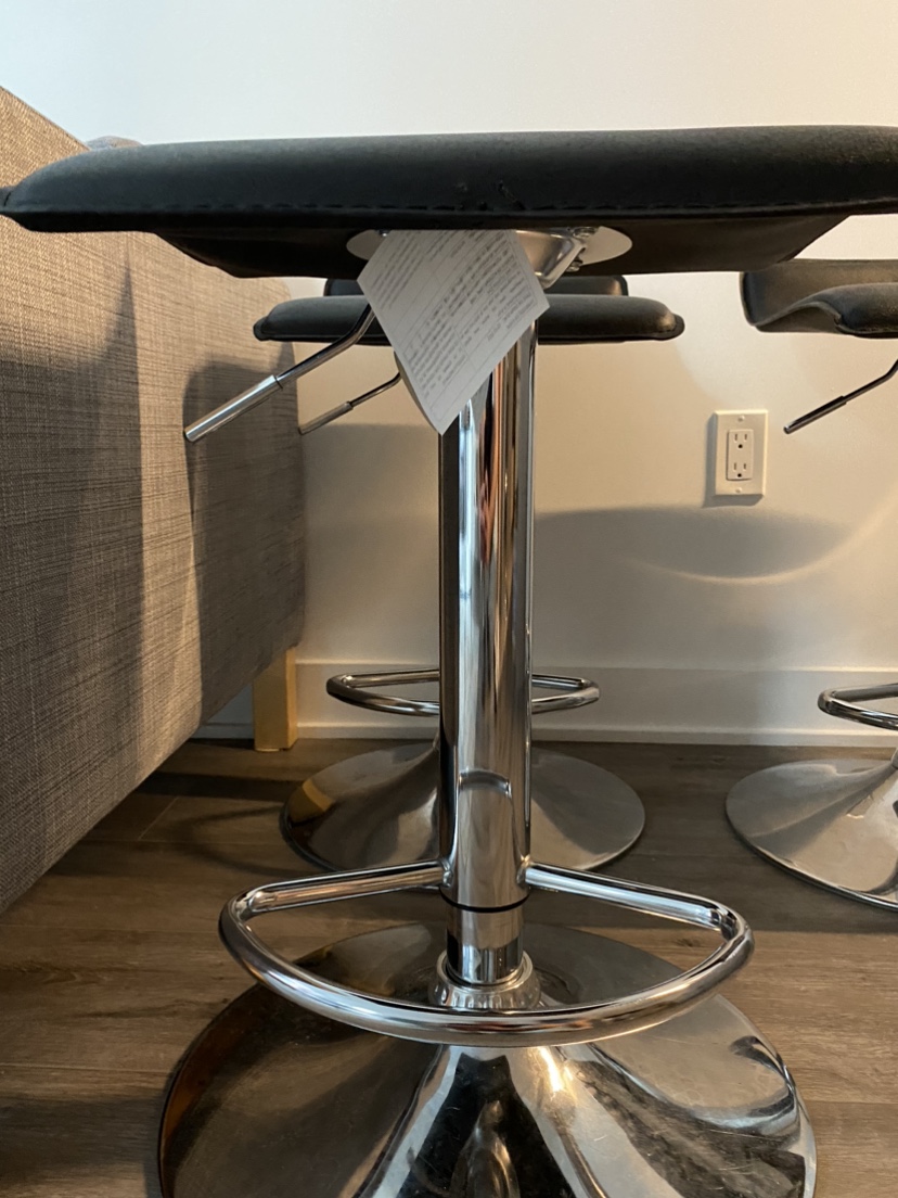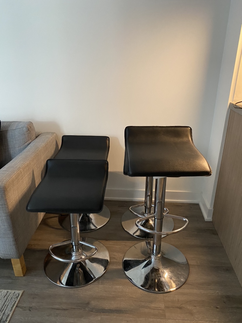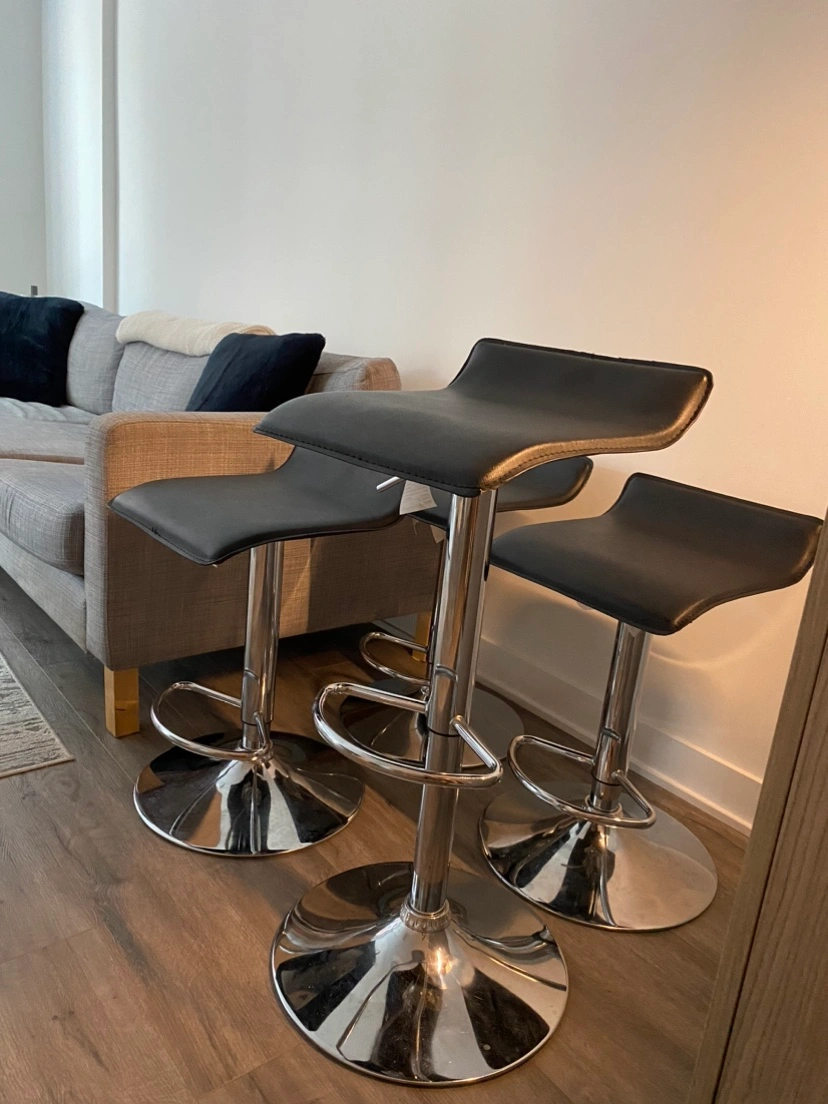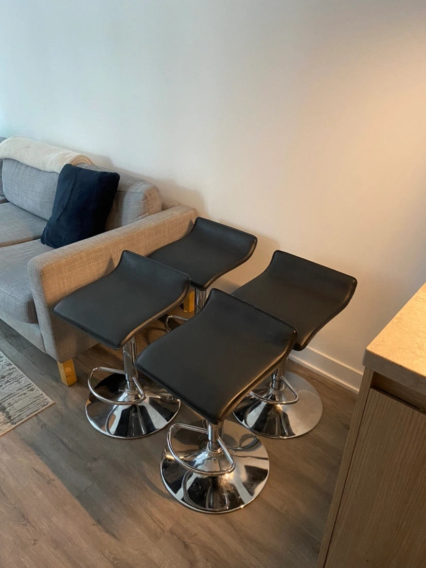 Set of 4 adjustable bar stools with black faux leather seats and chrome bases.