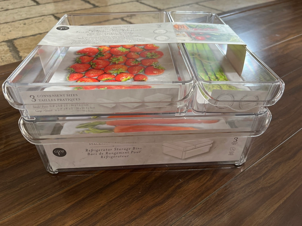 Set of 3 clear refrigerator storage bins in various sizes. Good for organizing your crisper drawer and making sure your produce lasts longer! The set comes with a small, medium, and large bin. They are stackable.