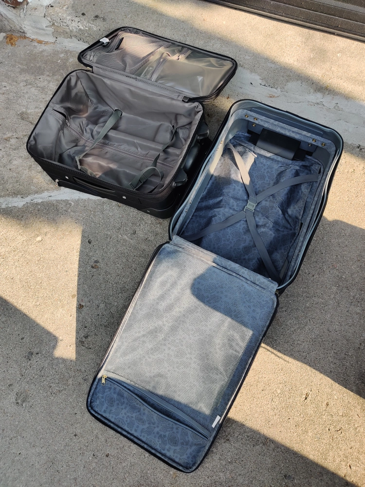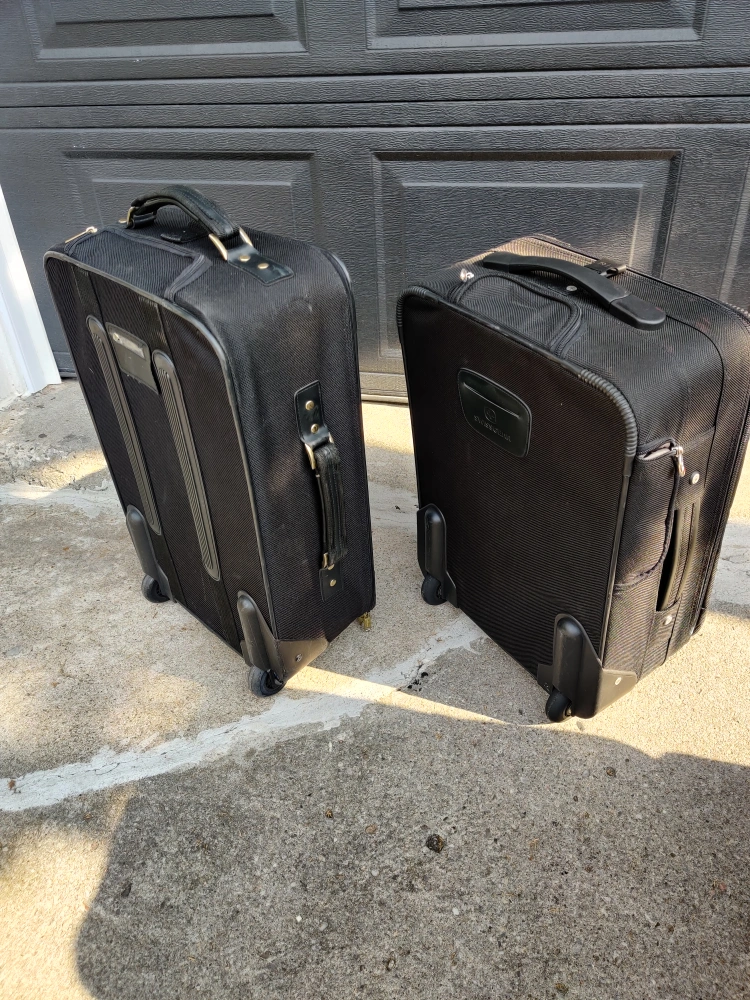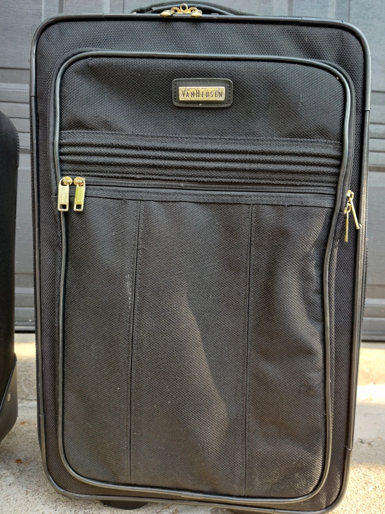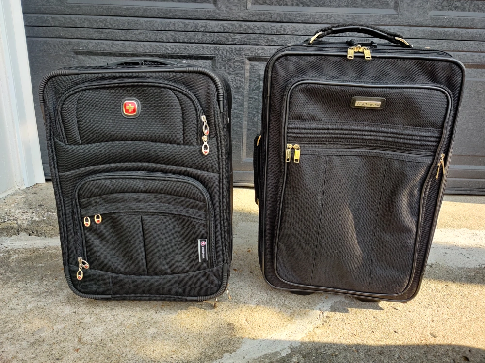 Set of two small size rolling suitcases. One is a SwissGear brand and the other is a Van Heusen brand. Both suitcases are black and have gold accents.