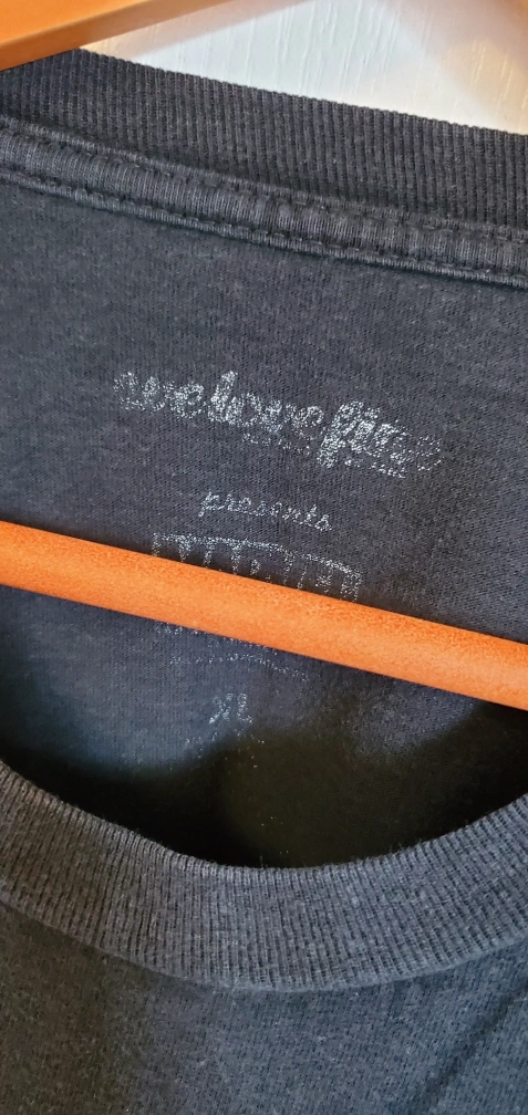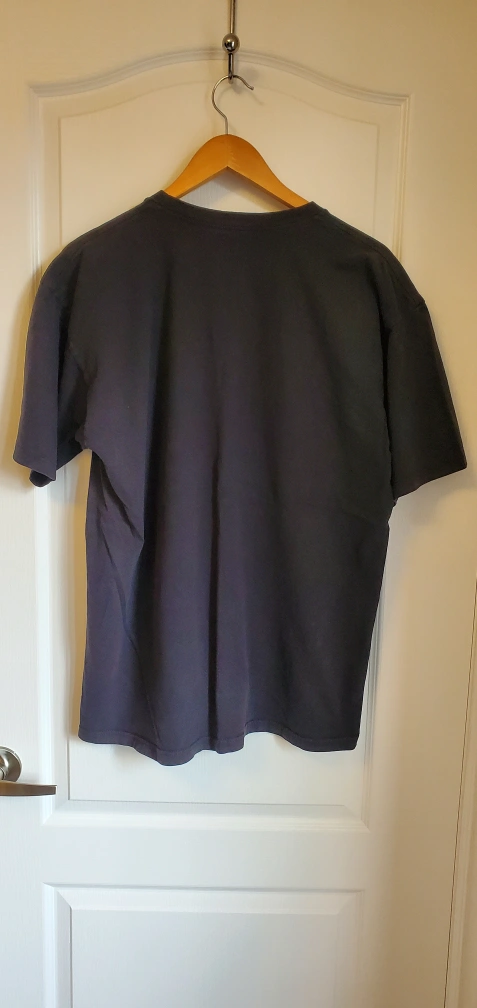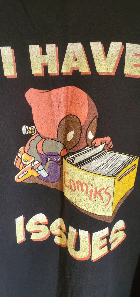 Black t-shirt with a graphic of Deadpool in a box with a bunch of comic books. The shirt reads "I have issues." It has a crew neck and short sleeves.