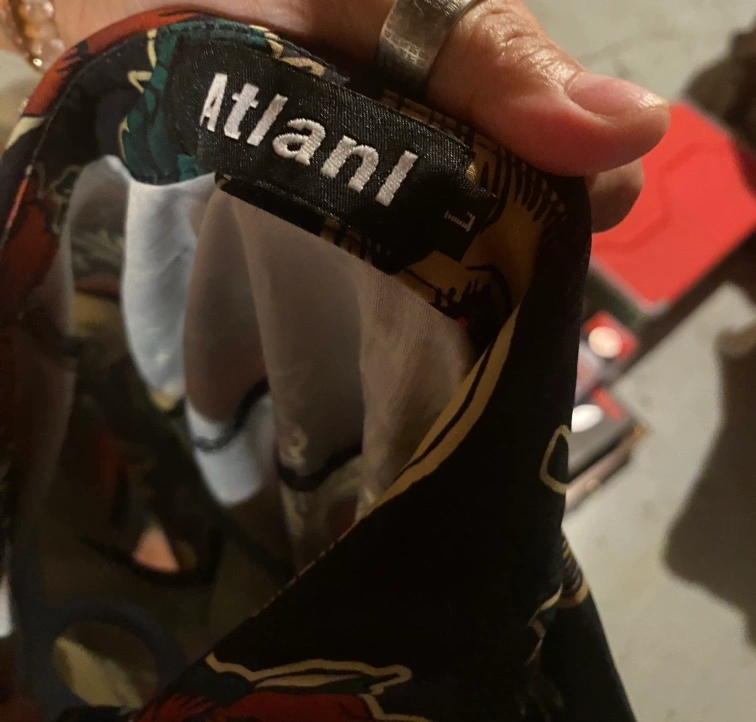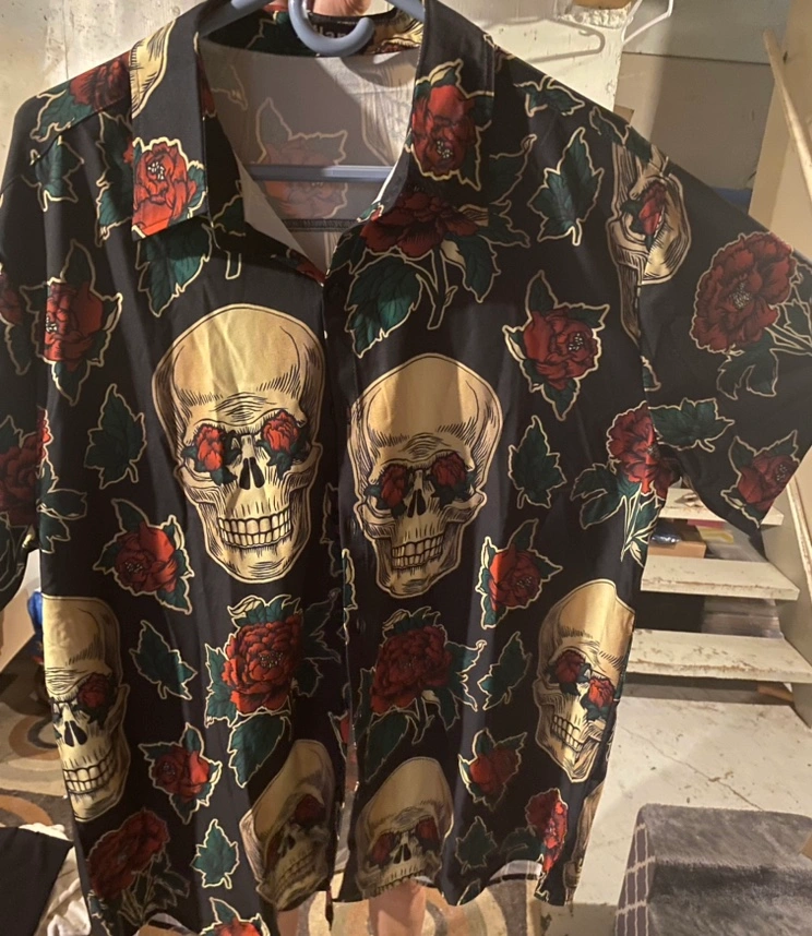 Short sleeve button up shirt with a skull and rose pattern. The shirt is black with red roses and gold skulls. The shirt is made by Attani. It has a collared neckline. The shirt is in good condition and has been washed.