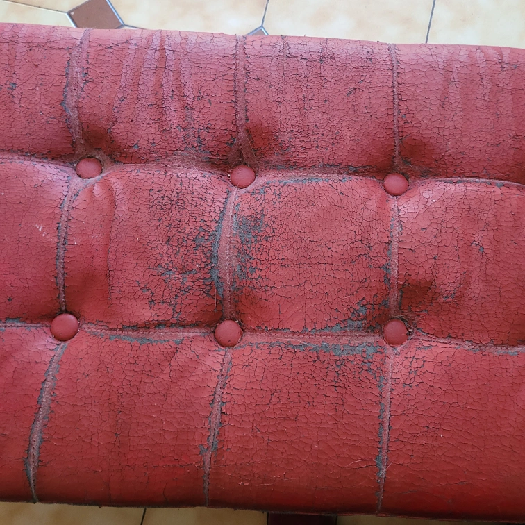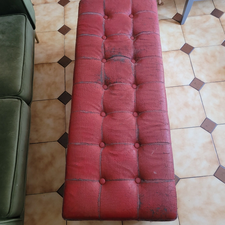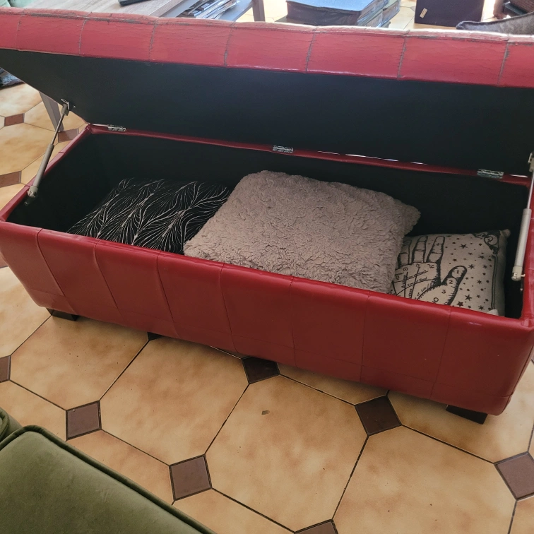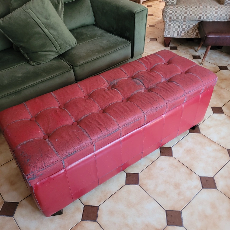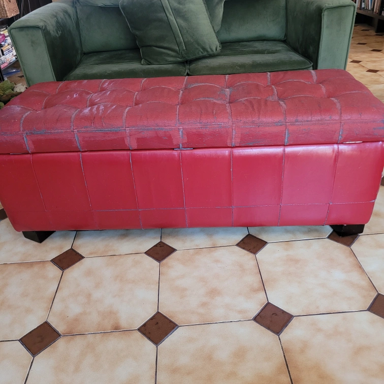 Red faux leather storage ottoman with tufted top and brown legs. It has hinges to open the top, which reveals a storage space. The ottoman is in good condition but has cracking in the material (pictured). Pick up only. Will be donating it in a week or two if not grabbed as I'm moving.