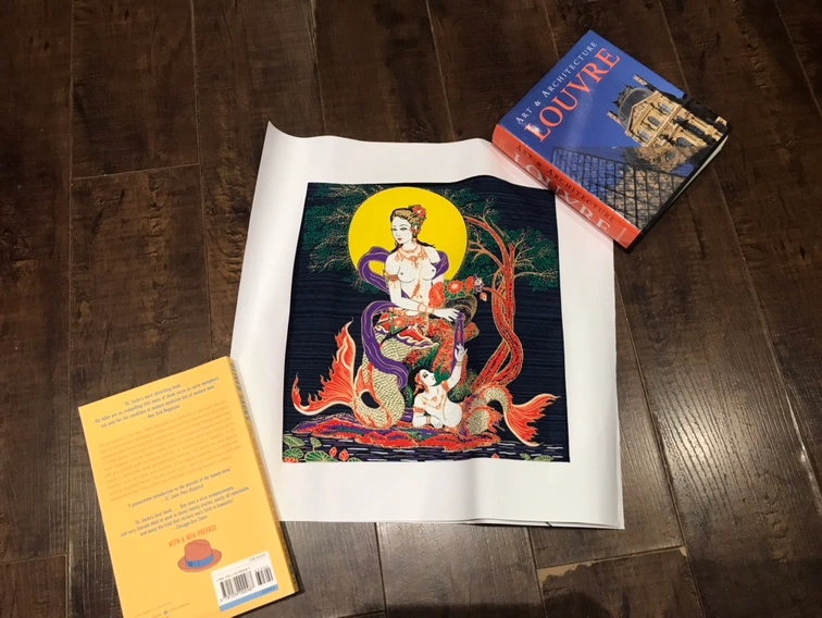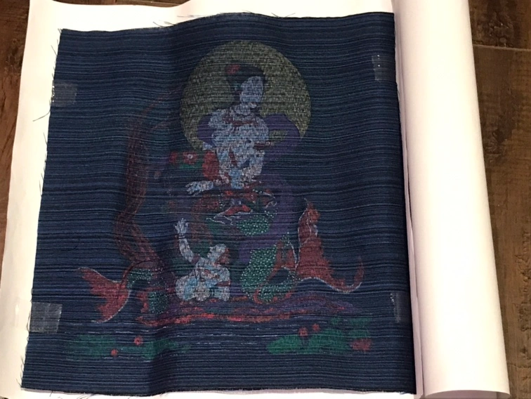 It’s a souvenir from Thailand, showing two mermaids in a moonlit scene, printed on Thai silk. The white paper border that surrounds it, is around 14 inches by 14 inches so the actual fabric is smaller than that. It was rolled up for storage so will need to be flattened before you put it in a frame. I do not have a frame for it.