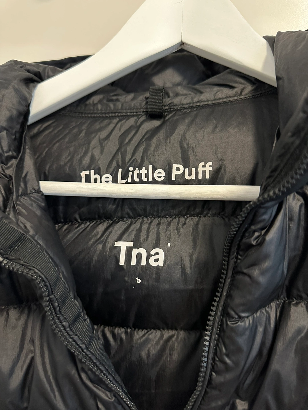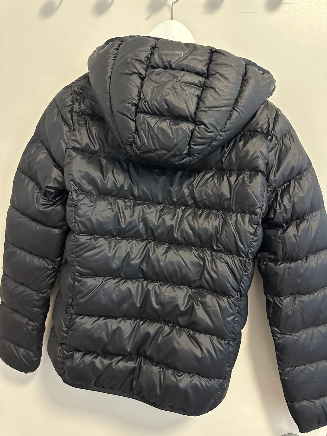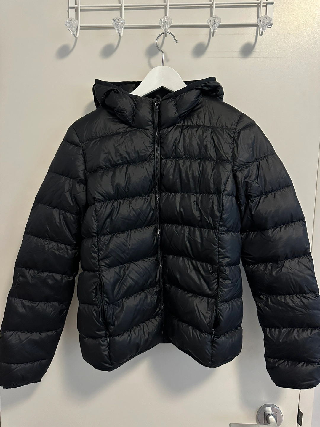 -Black puffer jacket with a hood. It is a lightweight jacket, perfect for layering. Zip up with 2 cozy pockets