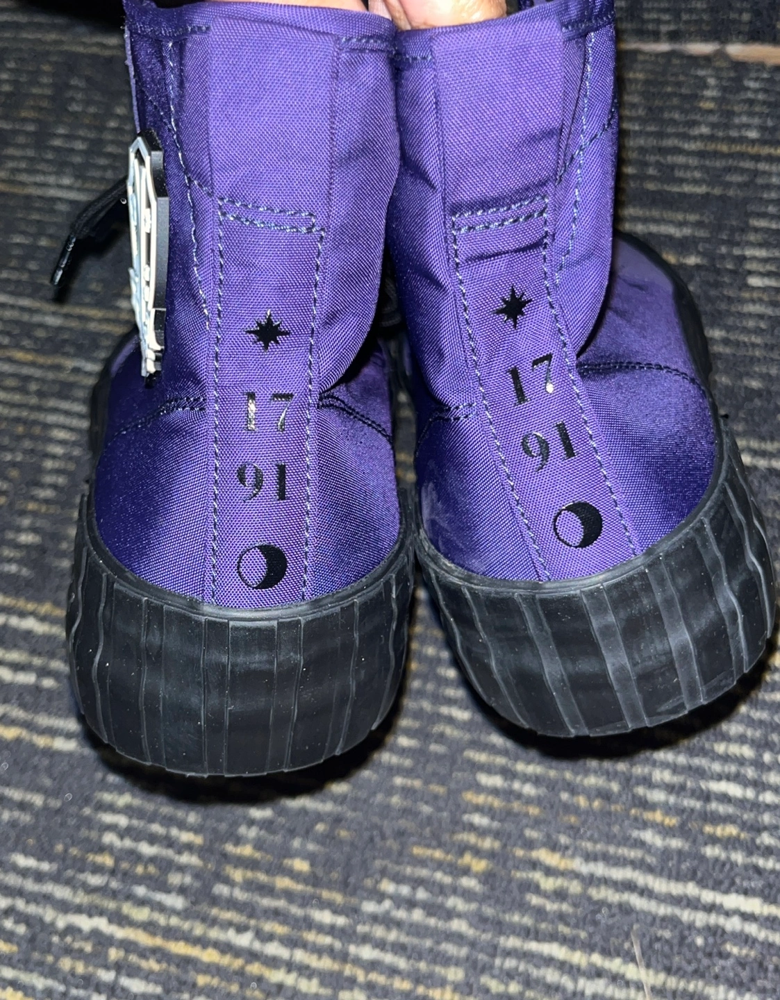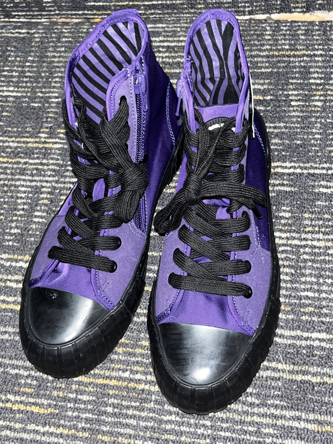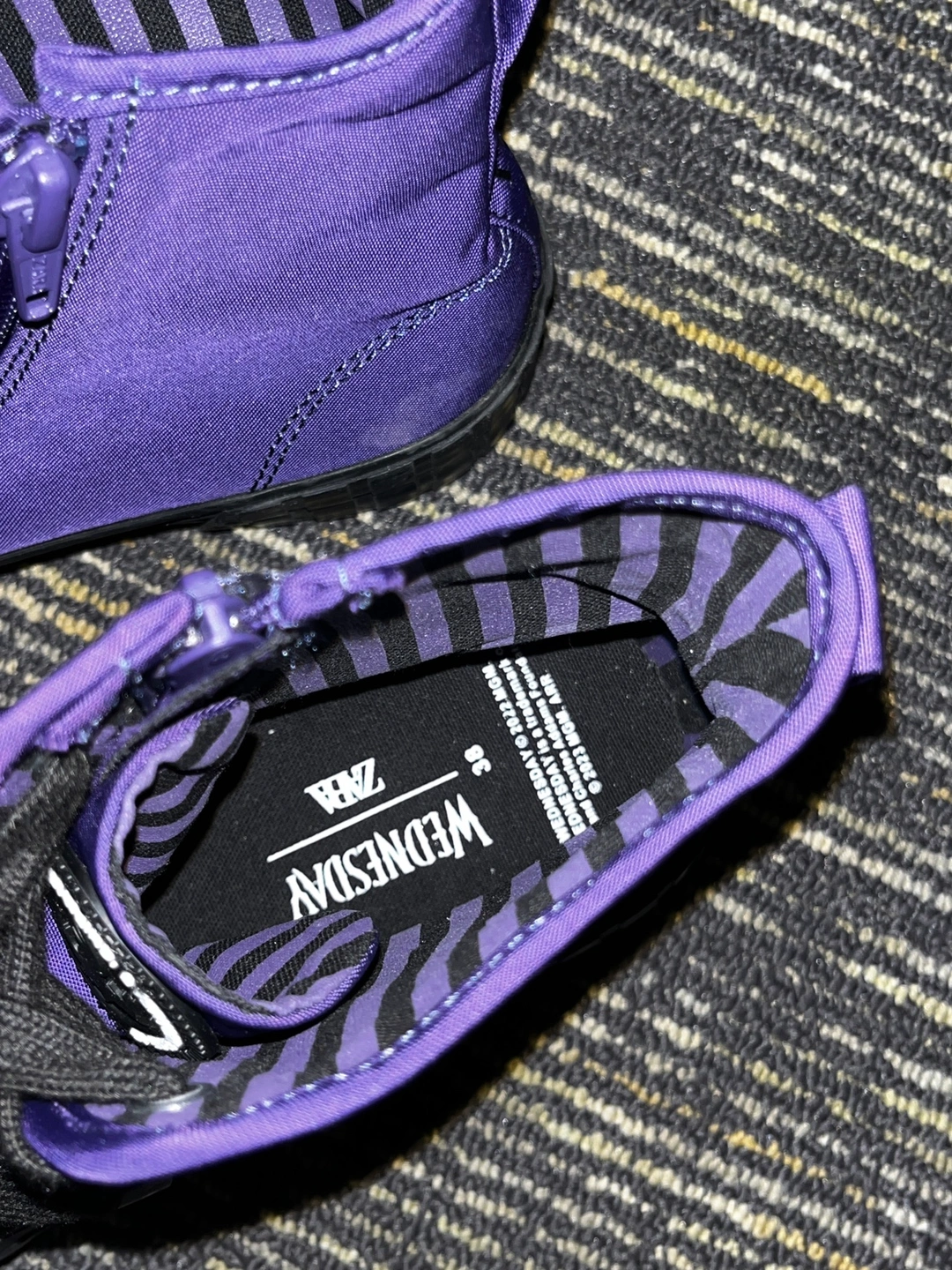 Brand new women’s ZARA Wednesday Addams high top sneakers in purple. They have a zipper on the side and a black and white striped lining. They are size 38.
