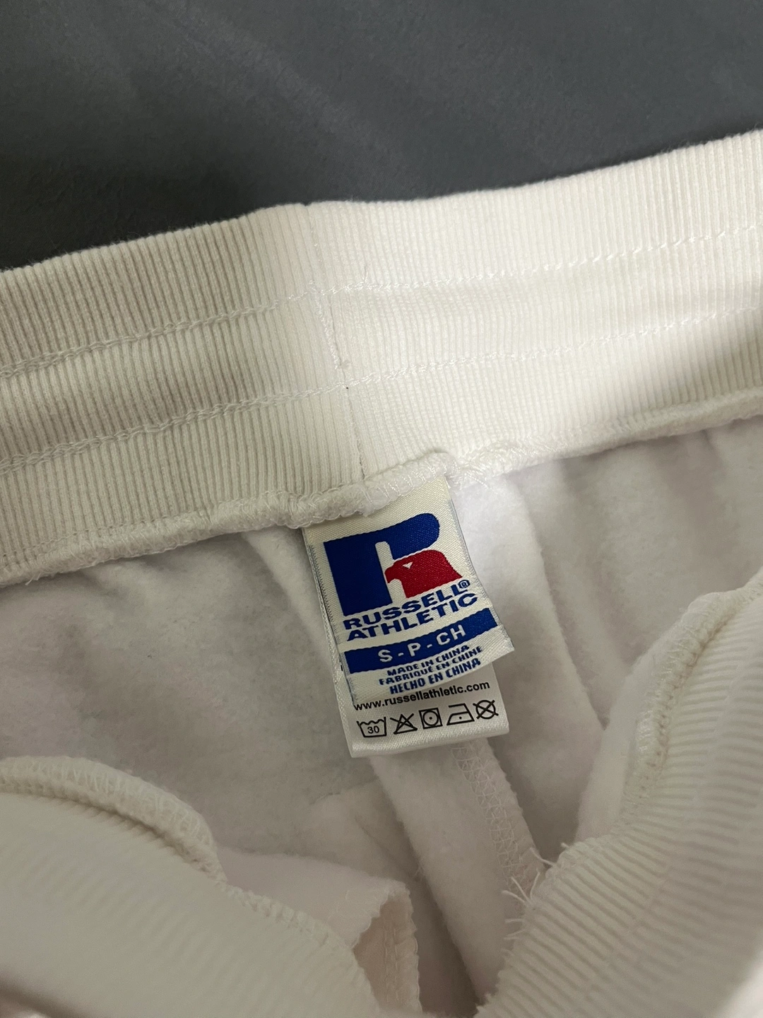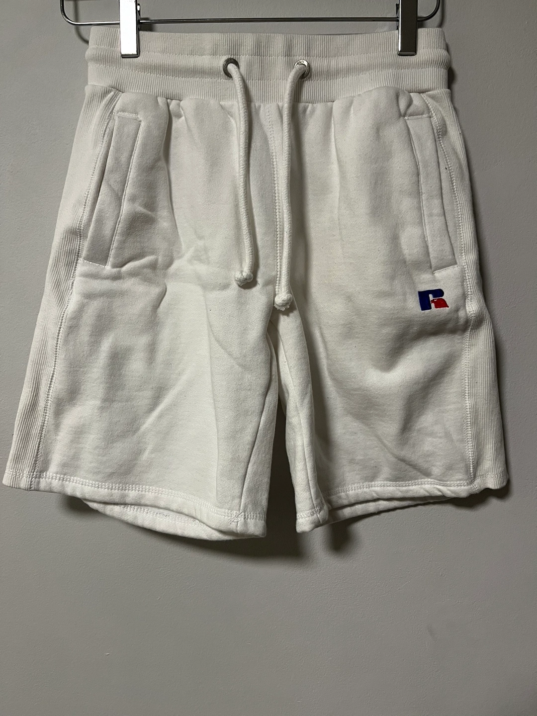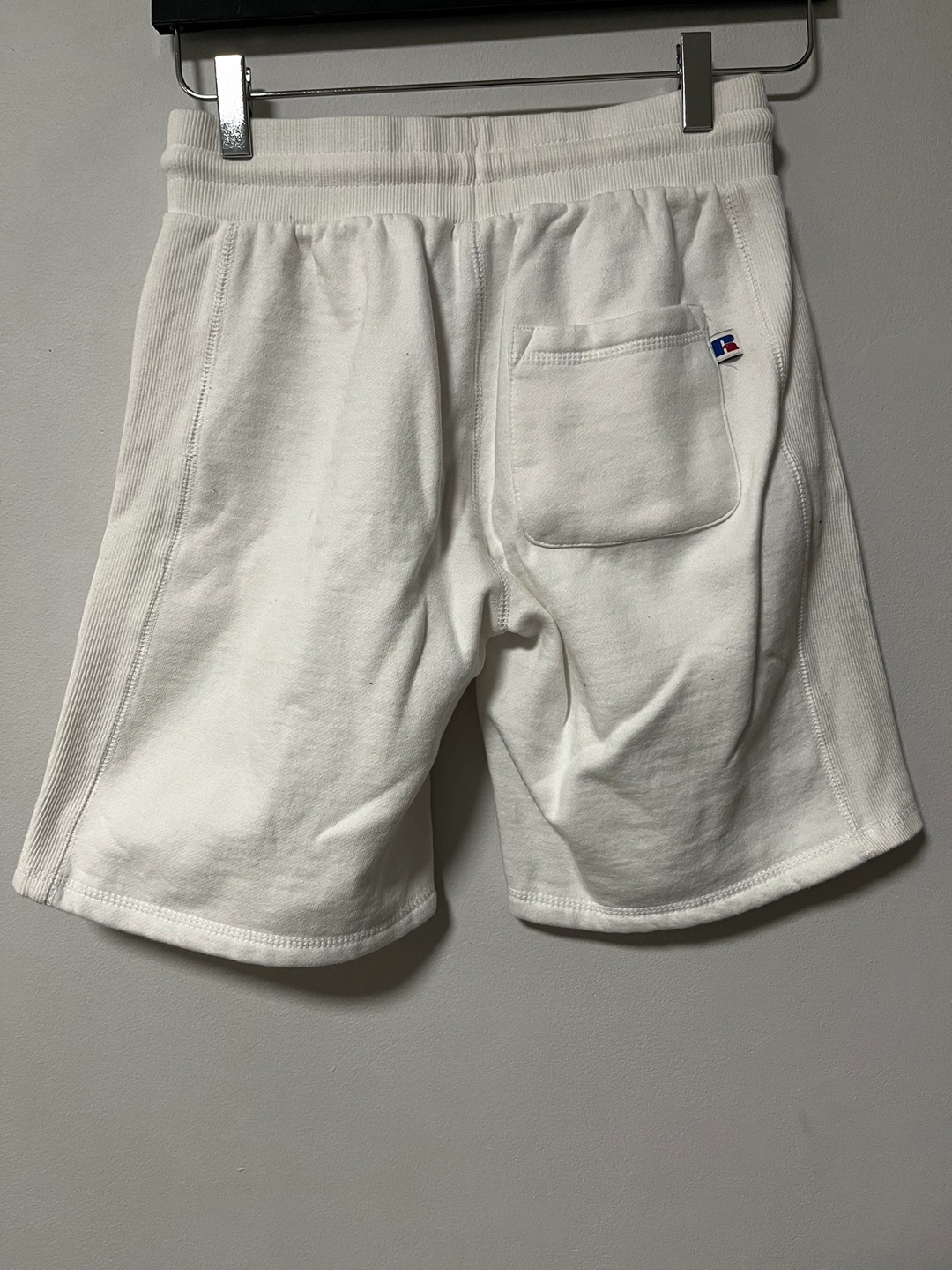 White athletic shorts with side stripes and a logo on the front and back.