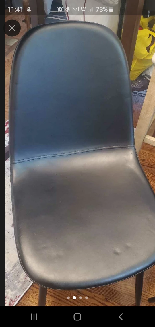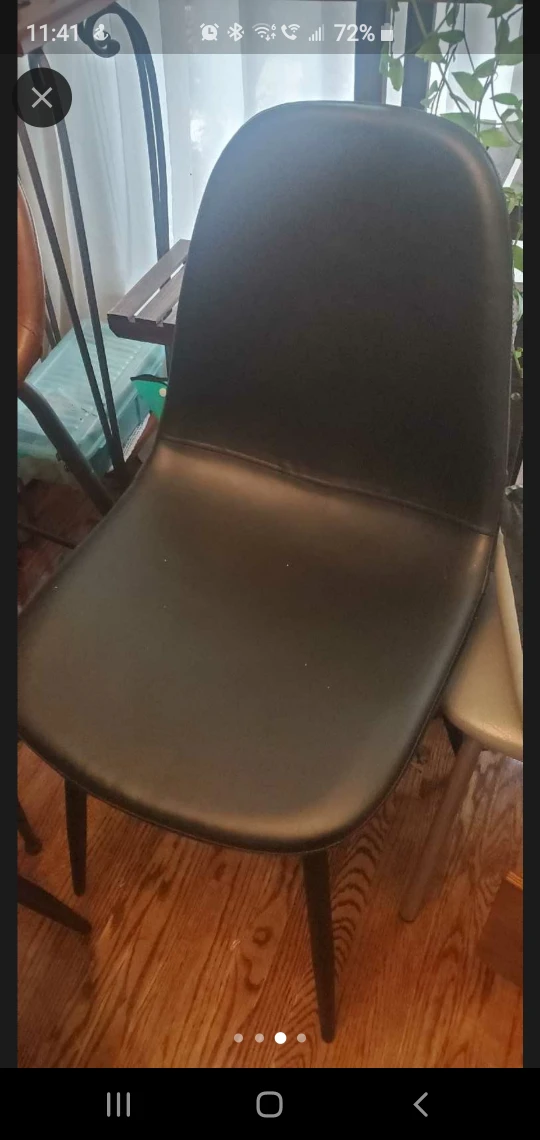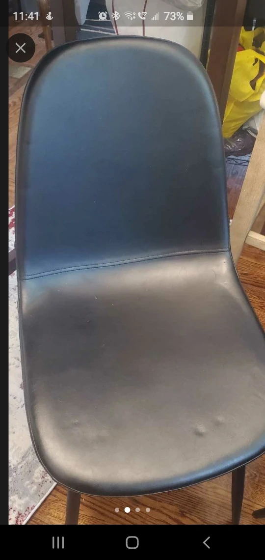 444Brand new with 1 chair having slight indents from shipping. Retails for $90 +taxes each...my price is for BOTH CHAIRS!!! High-quality vegan leather Powder-coated metal base Comfortable padded seat Wipe with a soft, dry cloth Maximum weight capacity: 120 kg DEPTH: 55 cm | 21.7" WIDTH: 44.5 cm | 17.5" HEIGHT: 87.5 cm | 34.4" SEAT HEIGHT: 47 cm | 18.5" WEIGHT: 4.7 kg https://www.wazofurniture.com/products/milan-eames-style-black-vintage-leather-dining-chair-with-black-metal-legs?variant=41367977037¤cy=CAD&utm_medium=product_sync&utm_source=google&utm_content=sag_organic&utm_campaign=sag_organic&gad_source=1&gclid=CjwKCAjwqre1BhAqEiwA7g9QhmgcaK4jijvSpauZT8wrE5MjjtzWSci9KPf9SUR4N2zVTaVxGTEyQhoCNNQQAvD_BwEA black dining chair with metal legs.