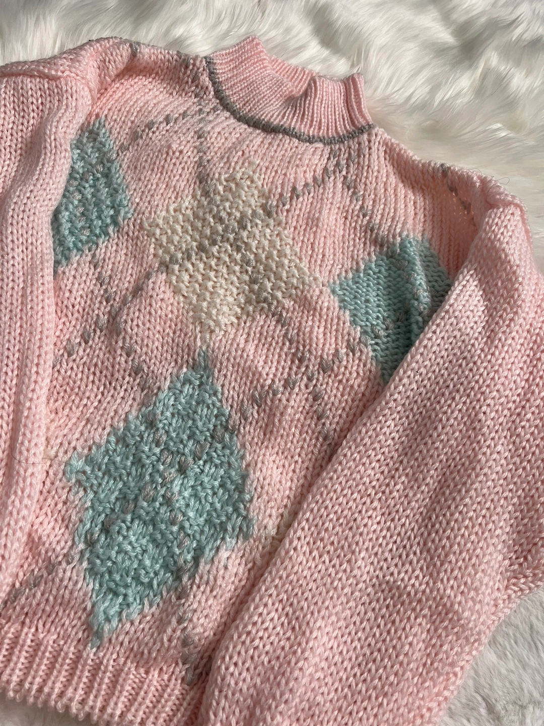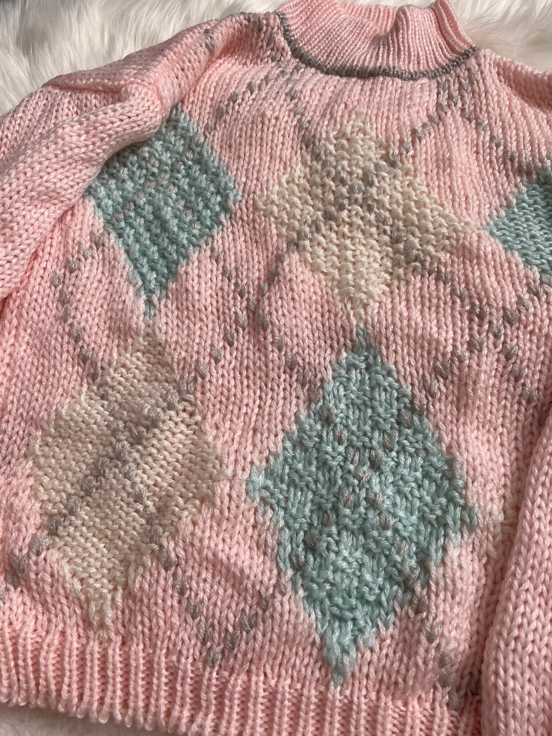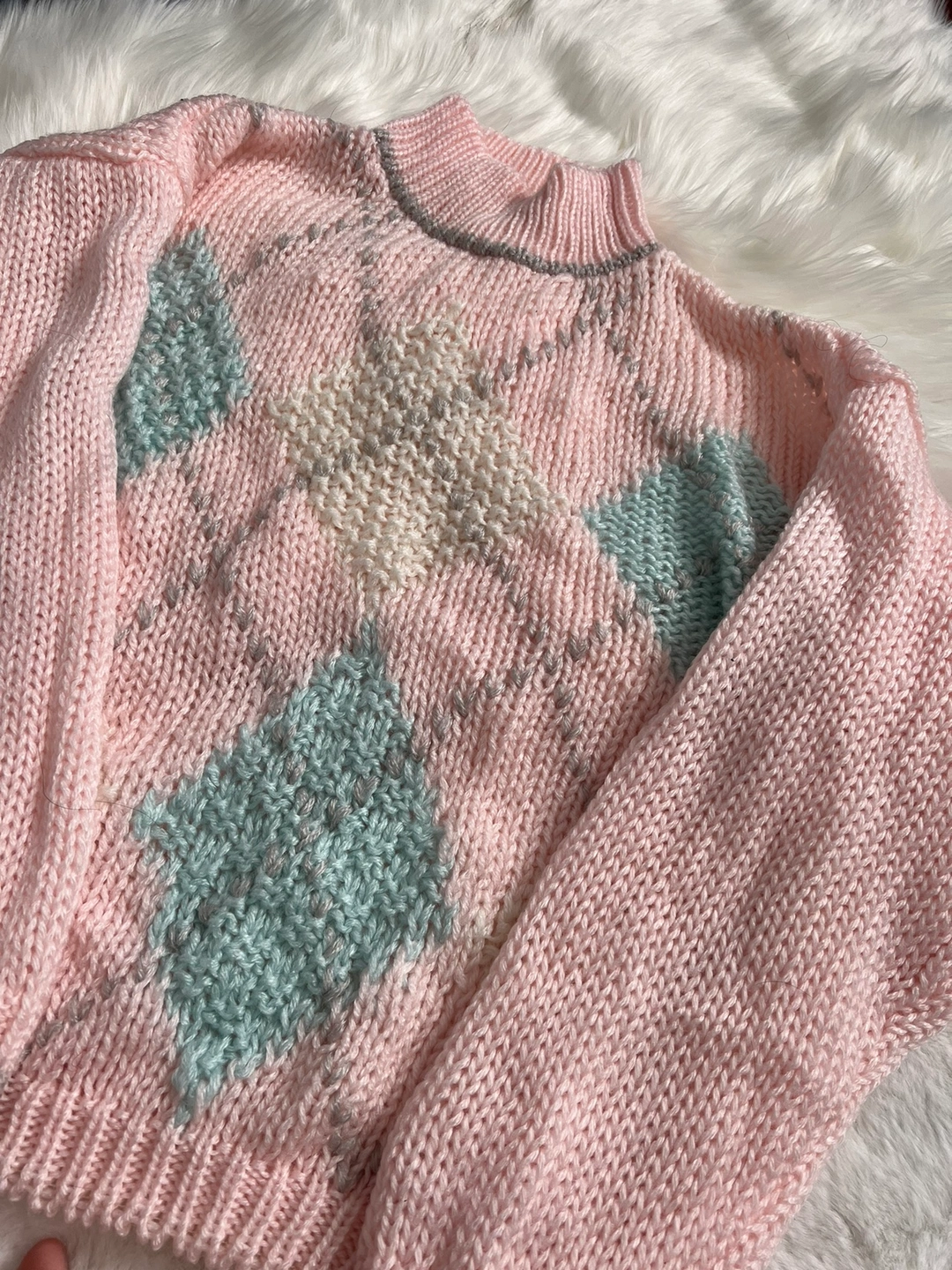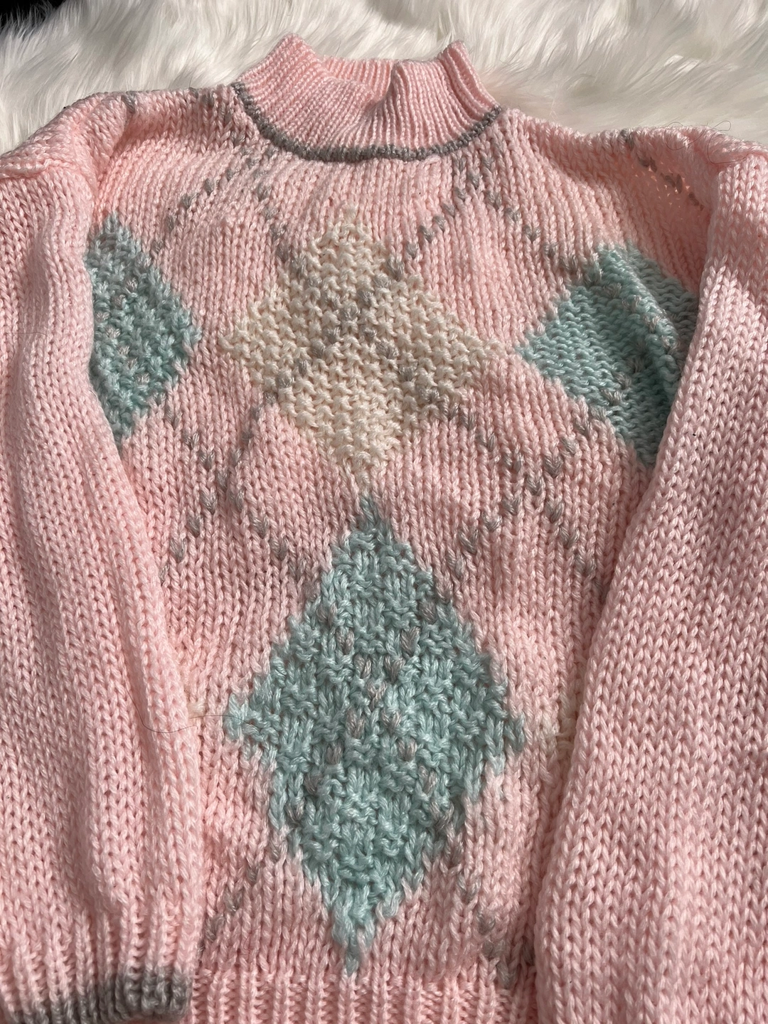Soft pink sweater with a classic argyle pattern in light blue, white, and grey. It has a mock neck. It is a very cozy and comfortable sweater that would be perfect for a casual day out or a cozy night in.