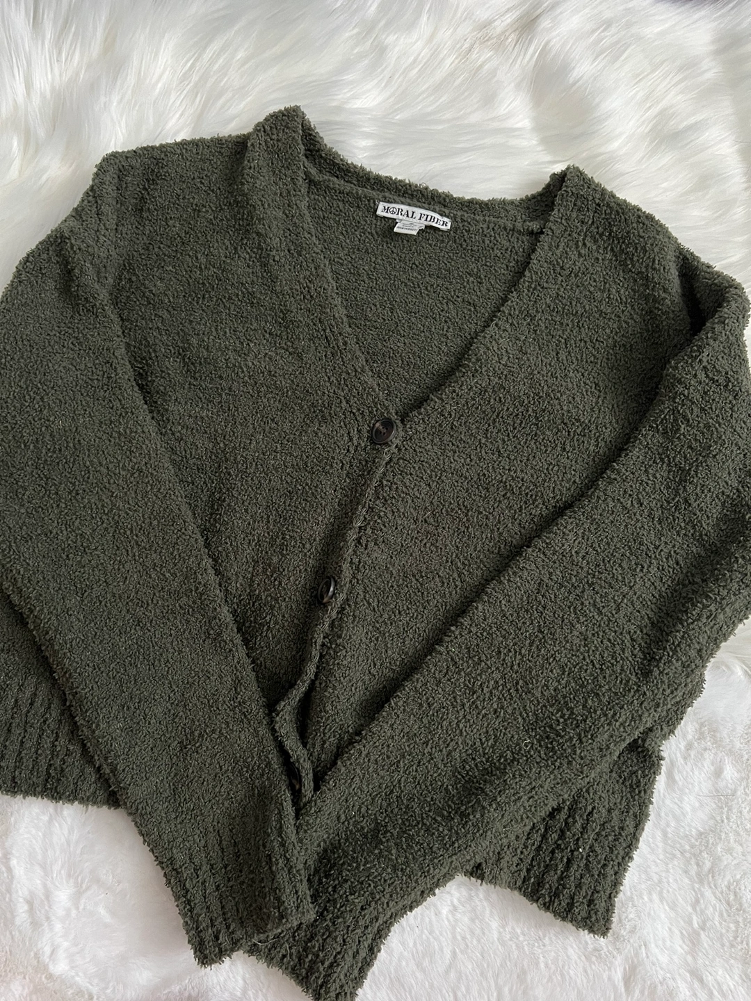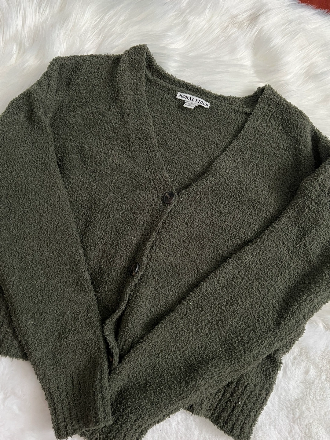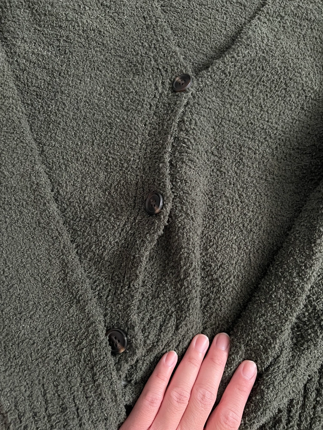 This is a green cardigan with a V-neck, long sleeves, and button closure.