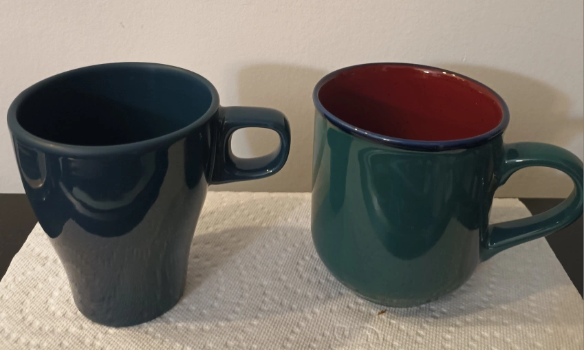 Set of two ceramic mugs, one teal blue and the other teal green. Both mugs have a curved body and a rounded handle. The green mug has a red interior with a blue and white trim.