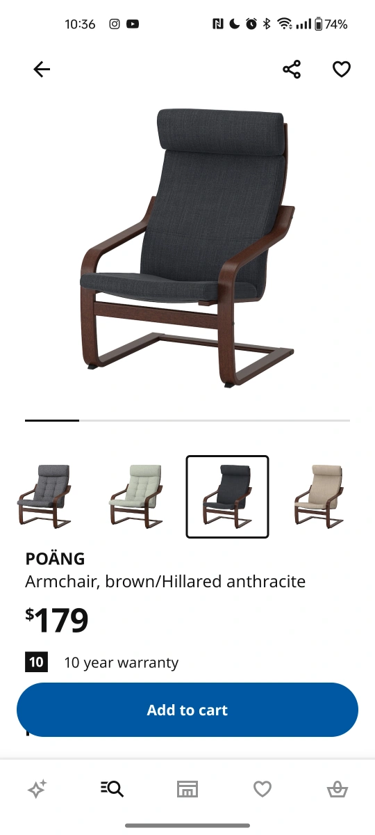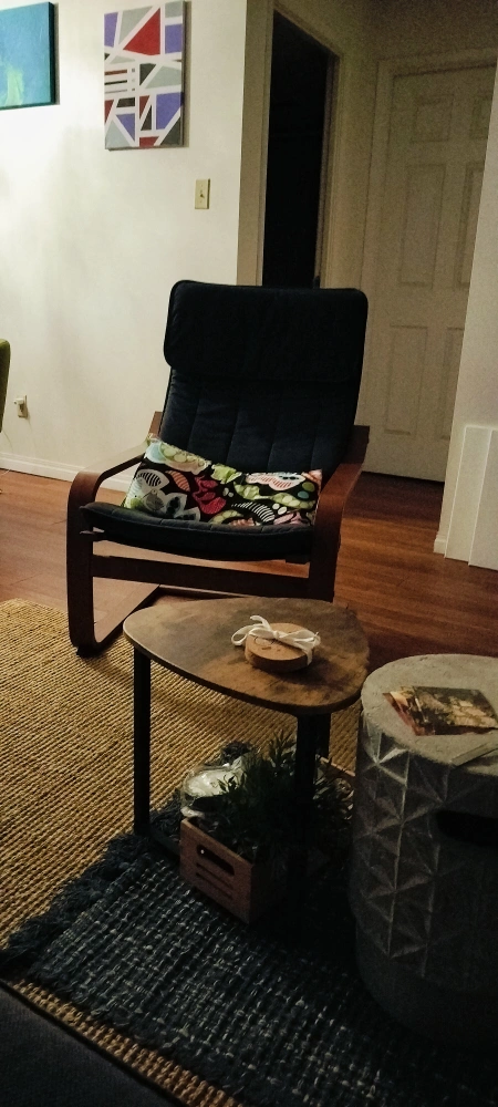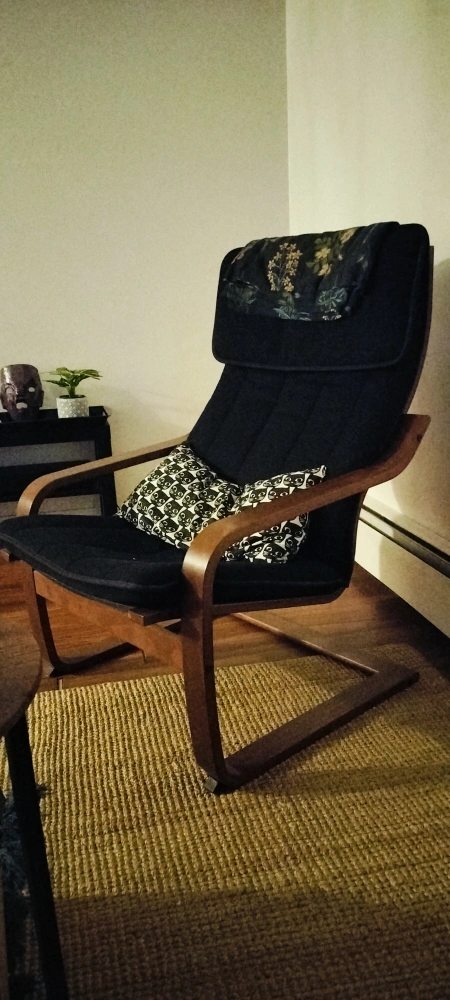 1 for $40, 2 for $60 A comfortable and stylish armchair with a wooden frame and a black fabric cover. The chair has a rocking base that makes it perfect for relaxing. It is in good condition and has been well cared for. It is perfect for a living room or bedroom. Compare at a total cost of $360 new with IKEA