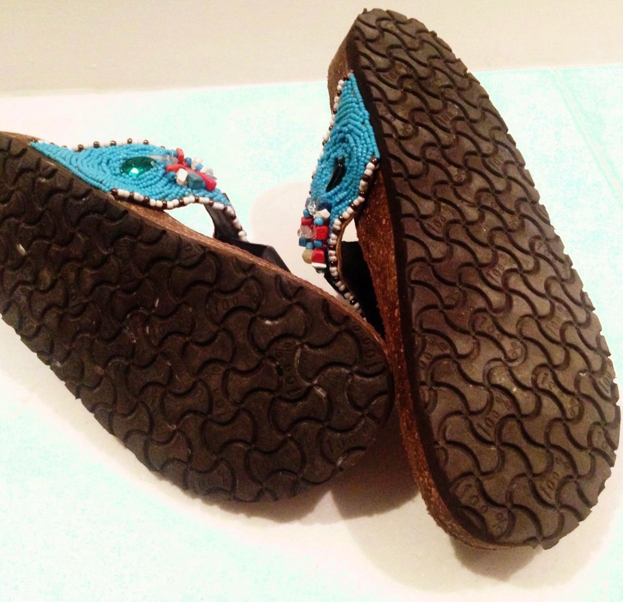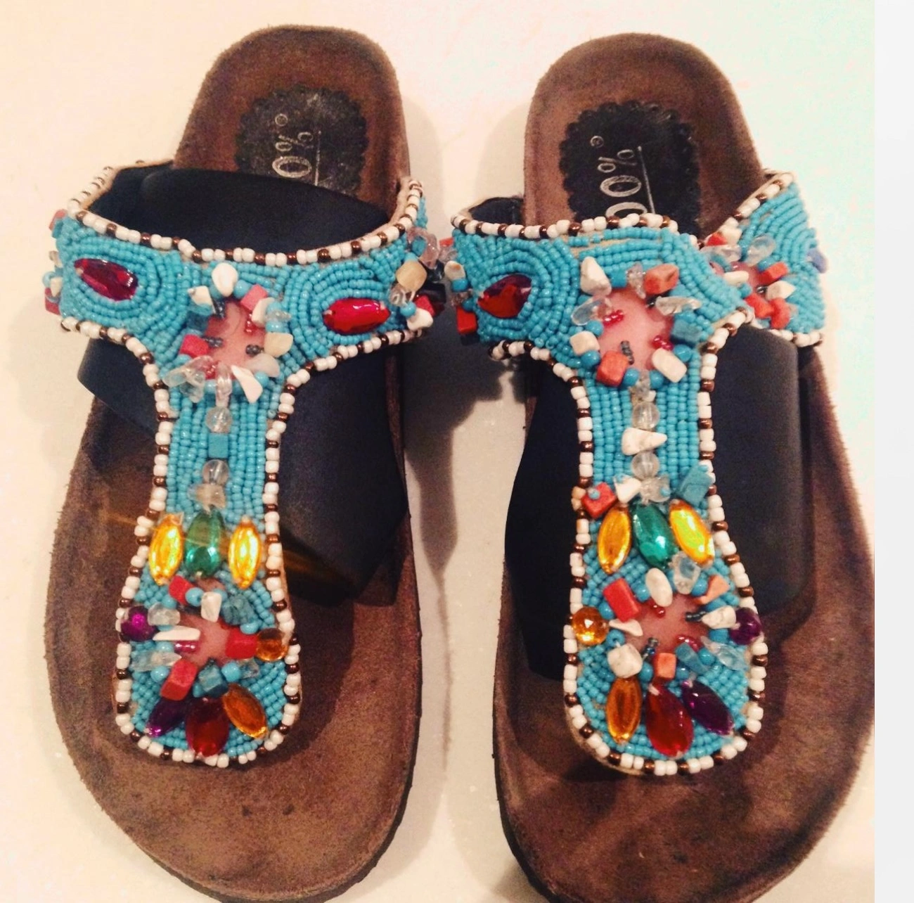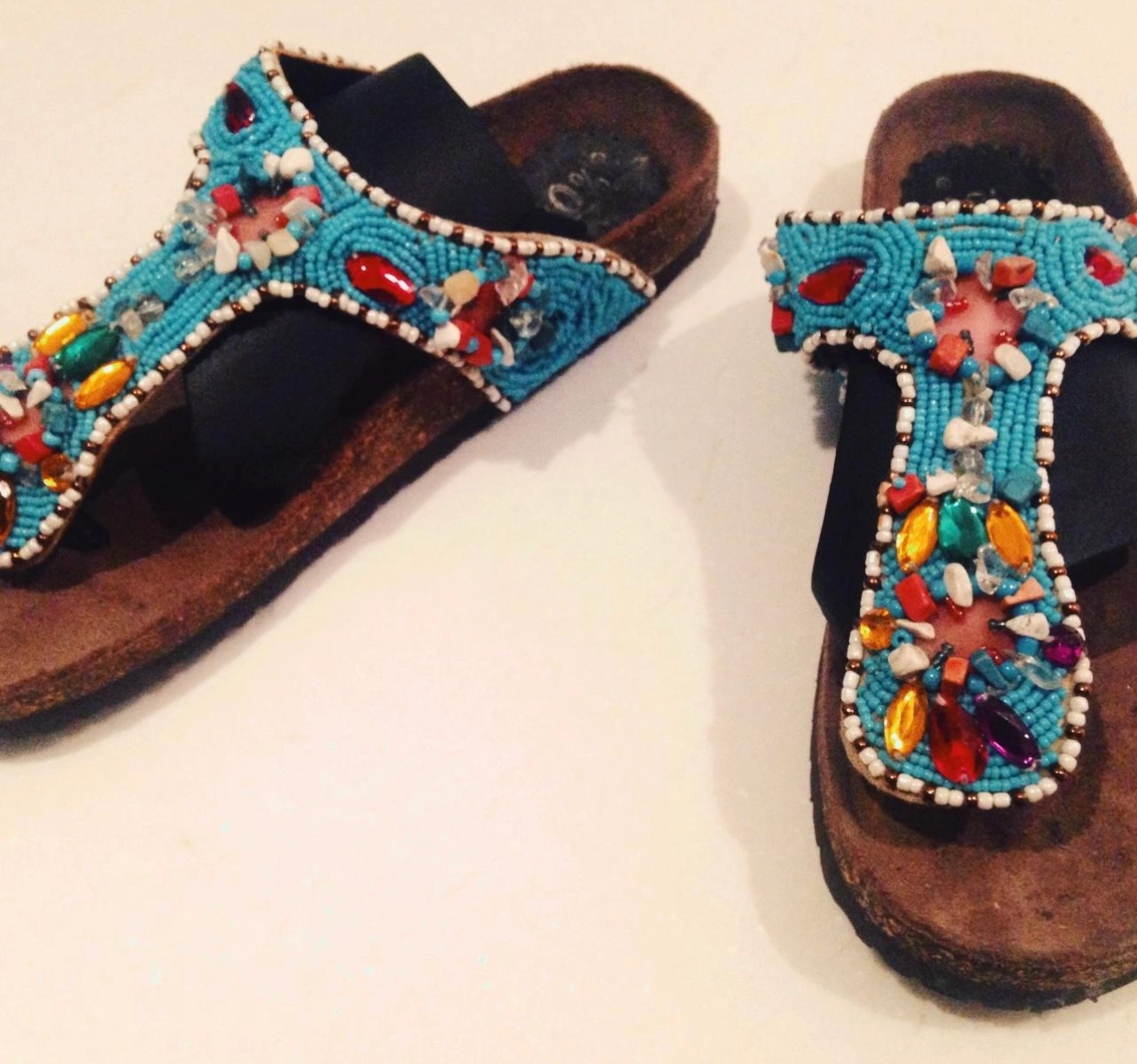 These are a beautiful pair of beaded sandals with lots of bright colours. They are a size 7. Rare! New. Never worn outside. Just once for photo shoot 100% brand beaded thongs . Blue with other colour beads and shells. So cute. For summer and holiday. Size 7 USA sizing. Looks like Birkenstocks with some life!