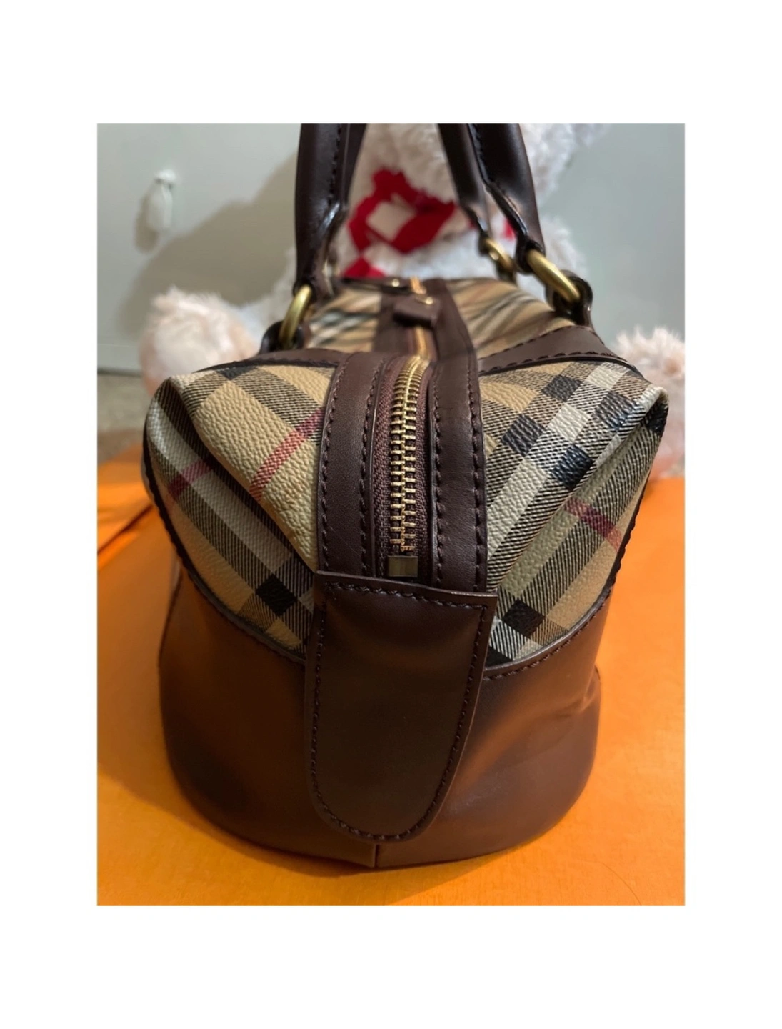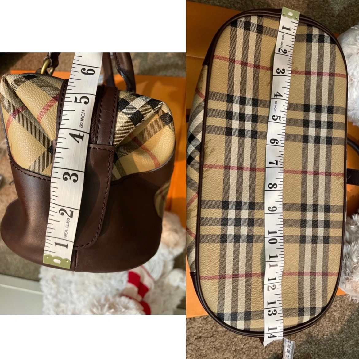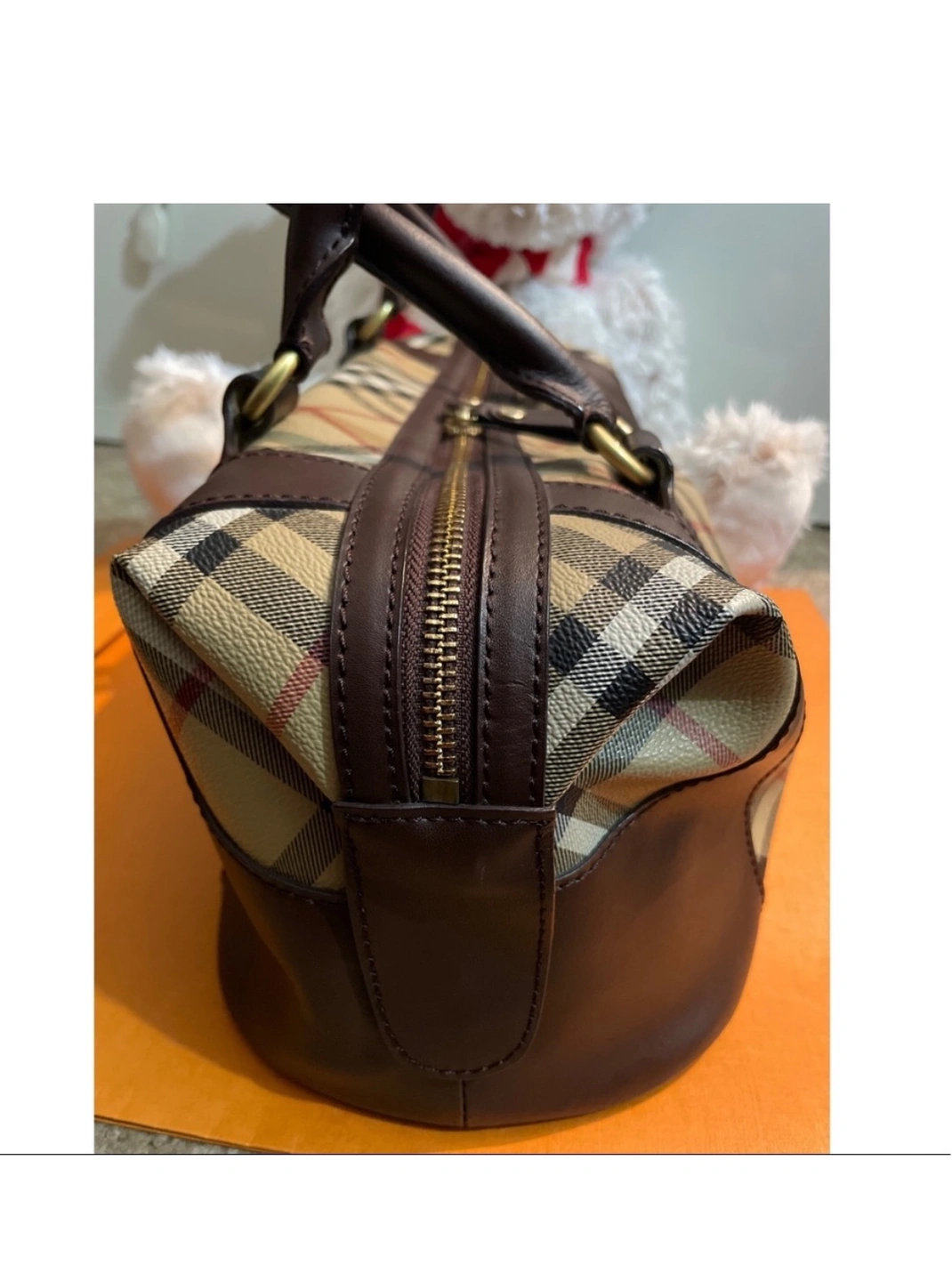 This is a classic Burberry handbag in the signature Nova Check pattern with brown leather accents. The bag has a top zipper closure, two top handles, Made in Italy. It is in good condition and is a great everyday bag.