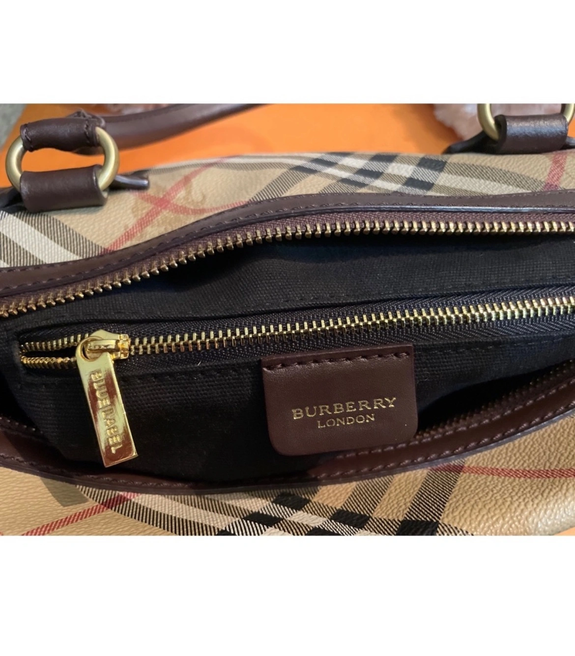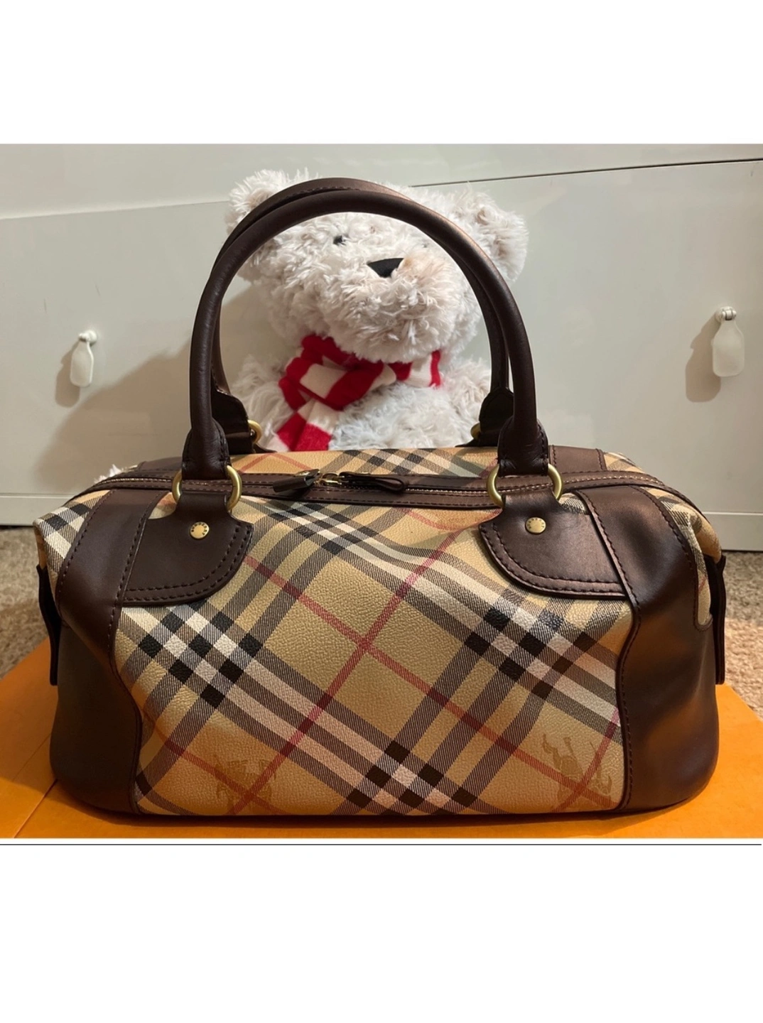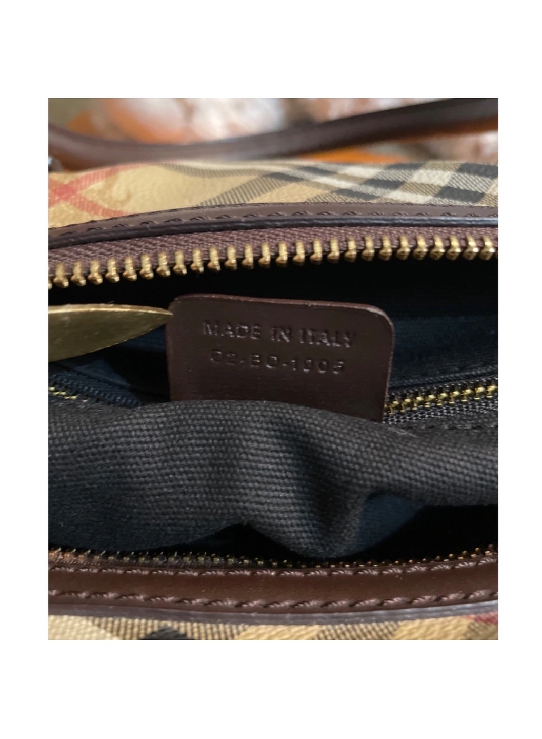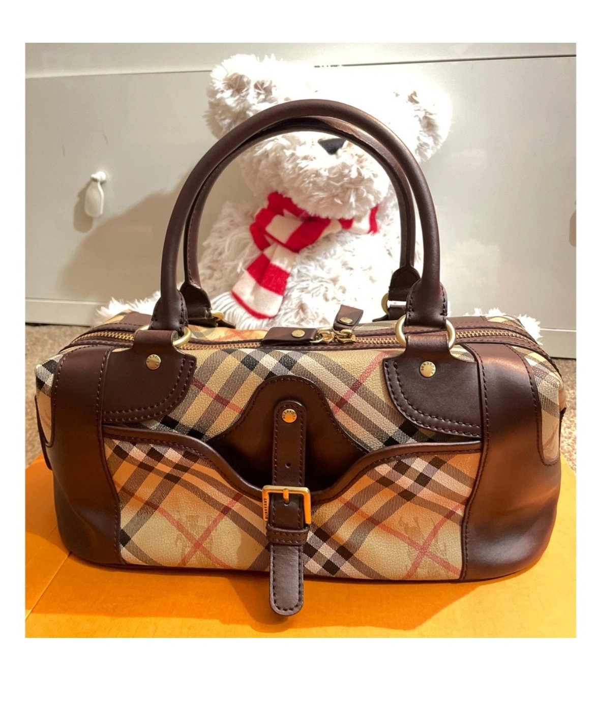 This is a classic Burberry handbag in the signature Nova Check pattern with brown leather accents. The bag has a top zipper closure, two top handles, Made in Italy. It is in good condition and is a great everyday bag.
