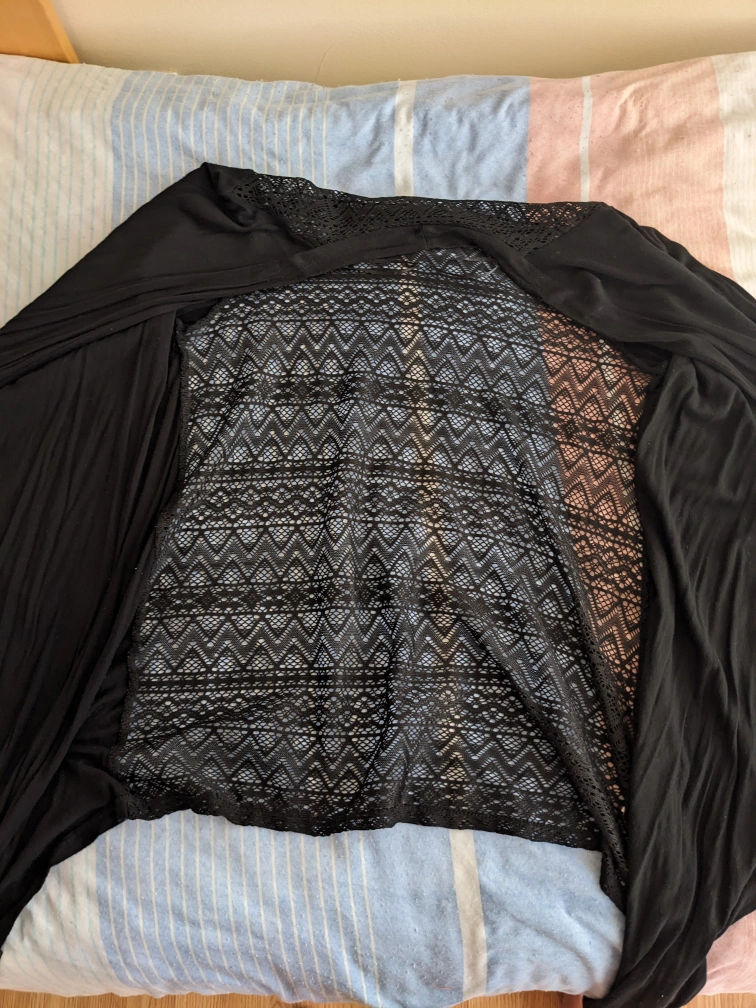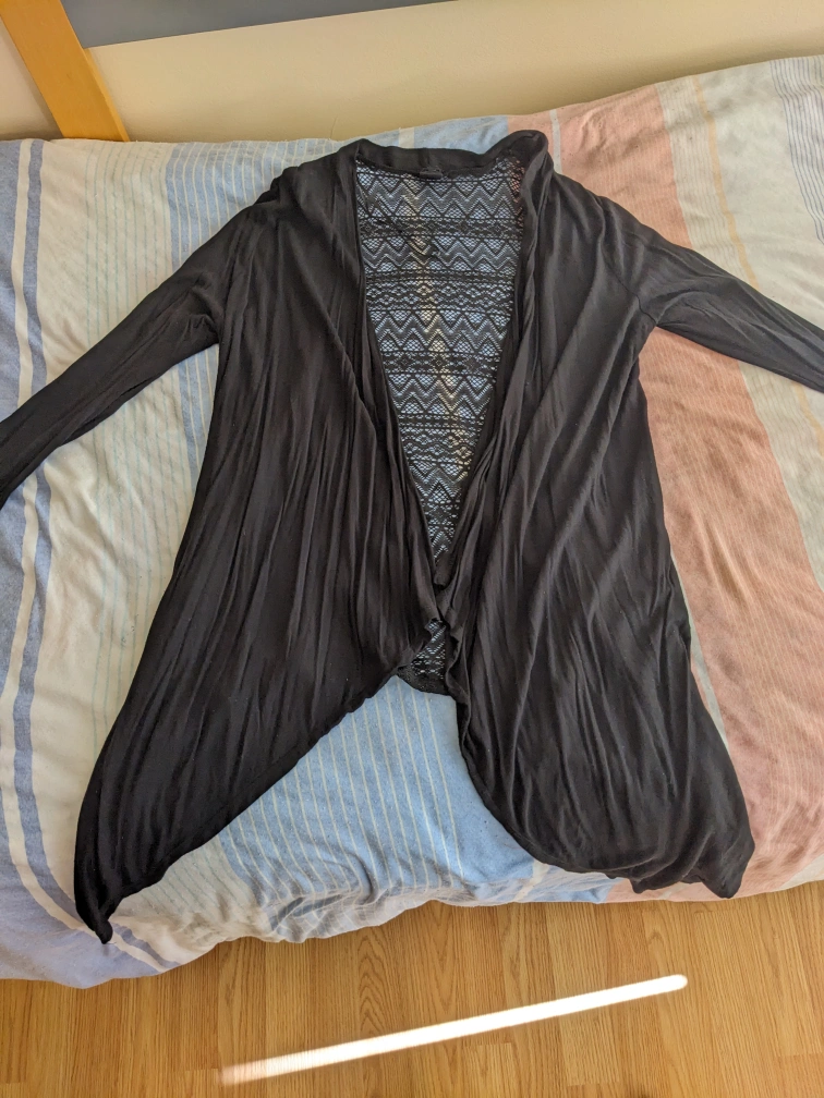 Long-sleeved cardigan with a black lace back. The cardigan is a size medium and has a draped style. It is a lightweight and flowy fabric.