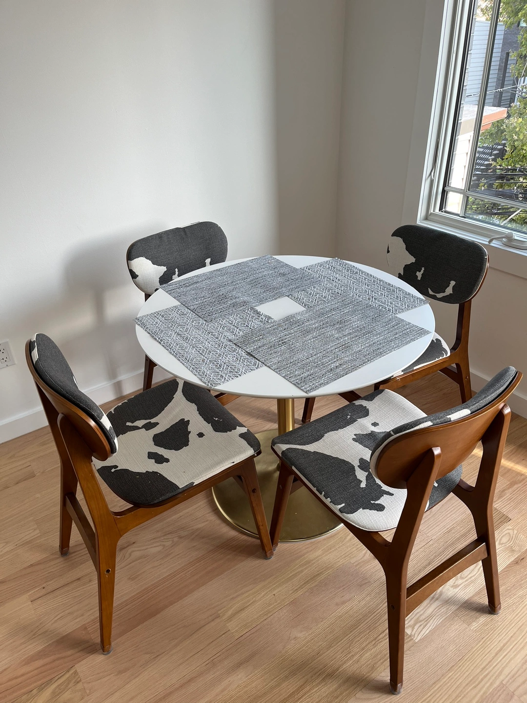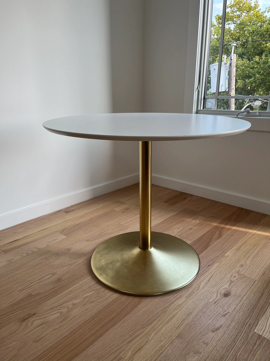 Round dining table with gold base, perfect for a small dining area or kitchen. No scratches or stains but the top has a slight wobble that can be fixed. Bought for $250 from Wayfair a couple years ago. Only selling because I moved and need a bigger dining table.