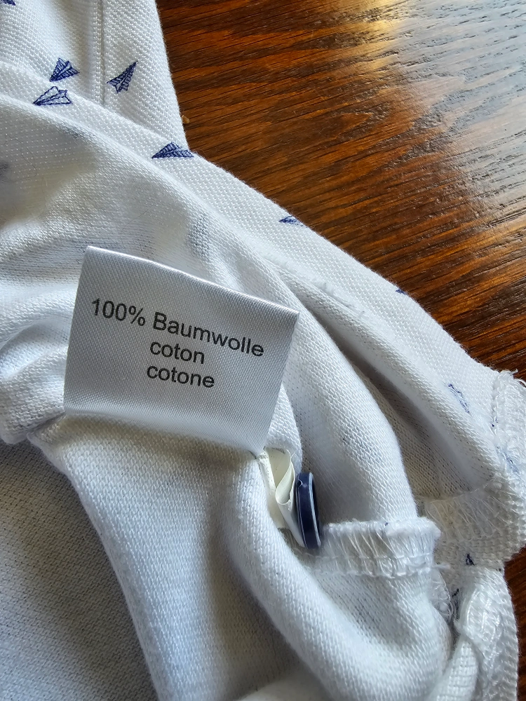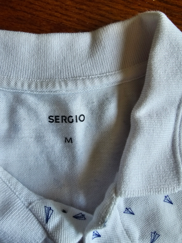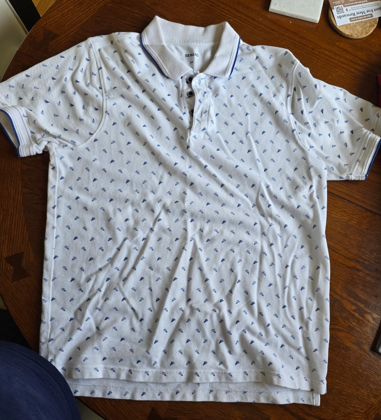 White men's polo shirt with blue paper airplane pattern. The shirt has a blue collar and is 100% cotton. The size is a medium. Literally new as it was worn 3 times