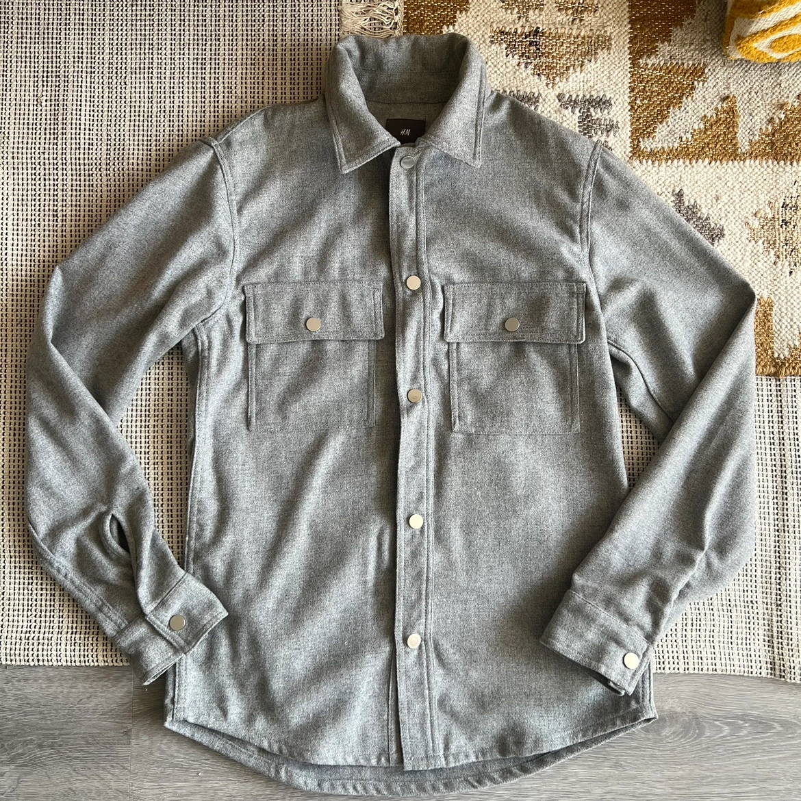 A grey flannel shirt with long sleeves, a button-up front, and two front pockets.
