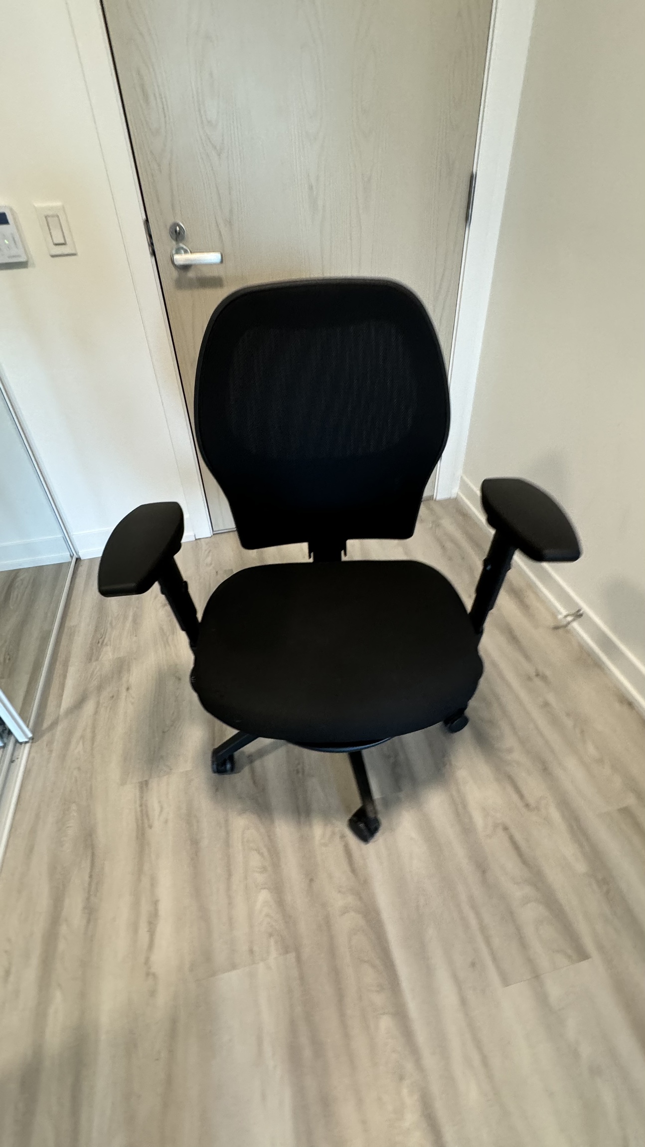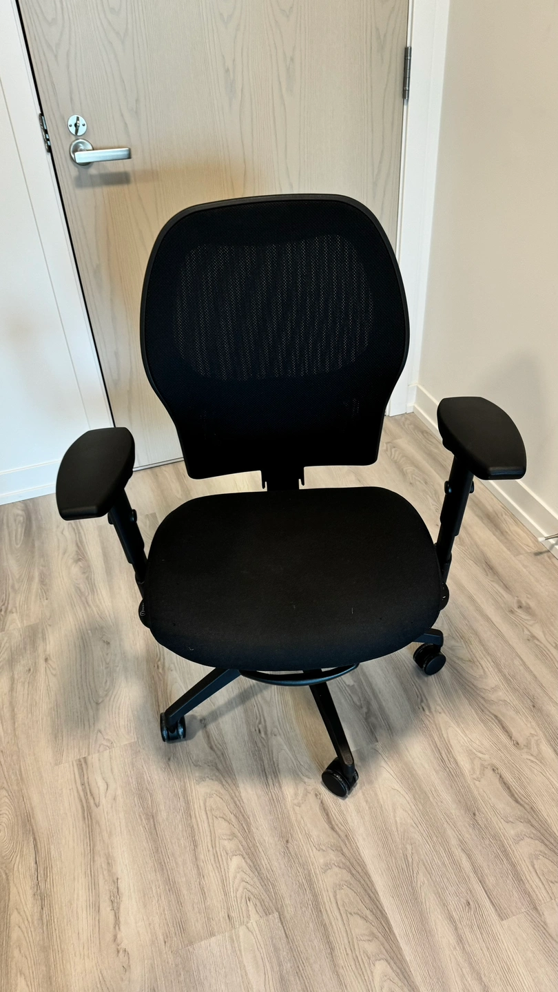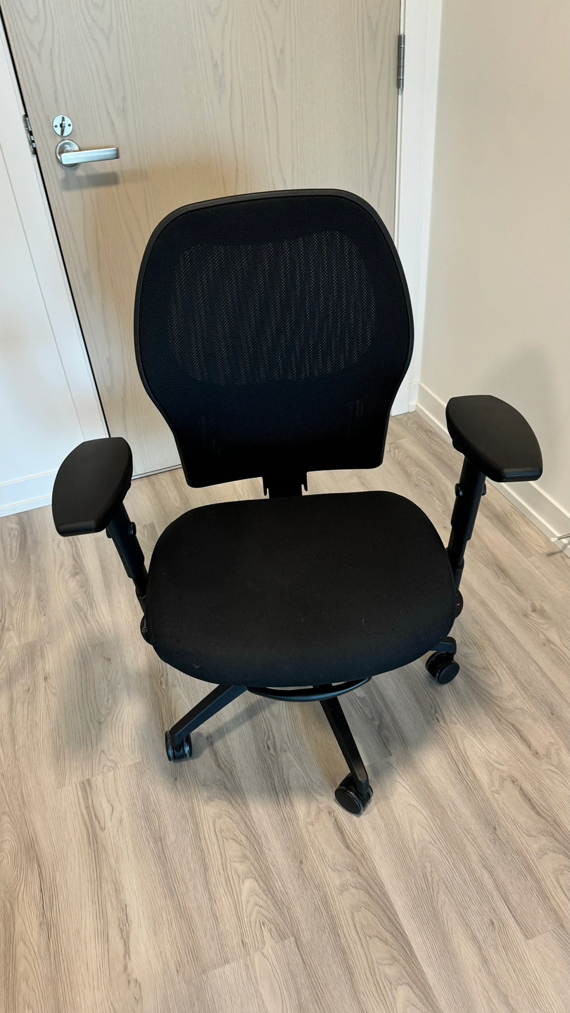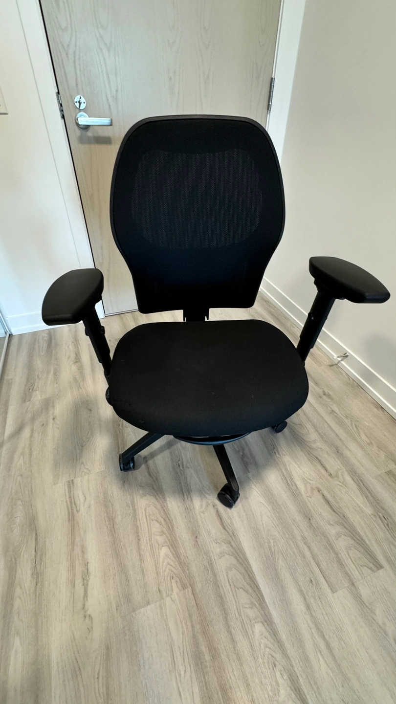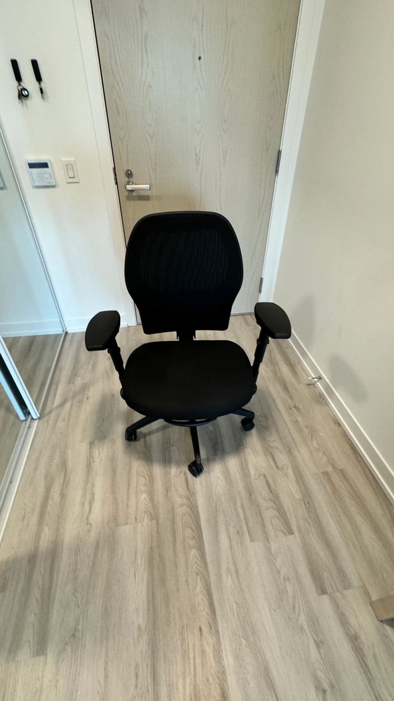Black office chair with adjustable height and armrests. It is on wheels and in good condition.