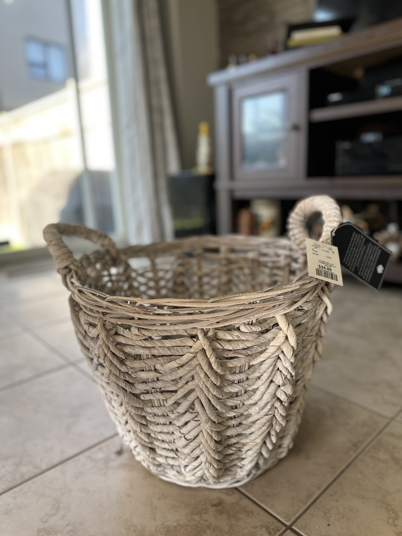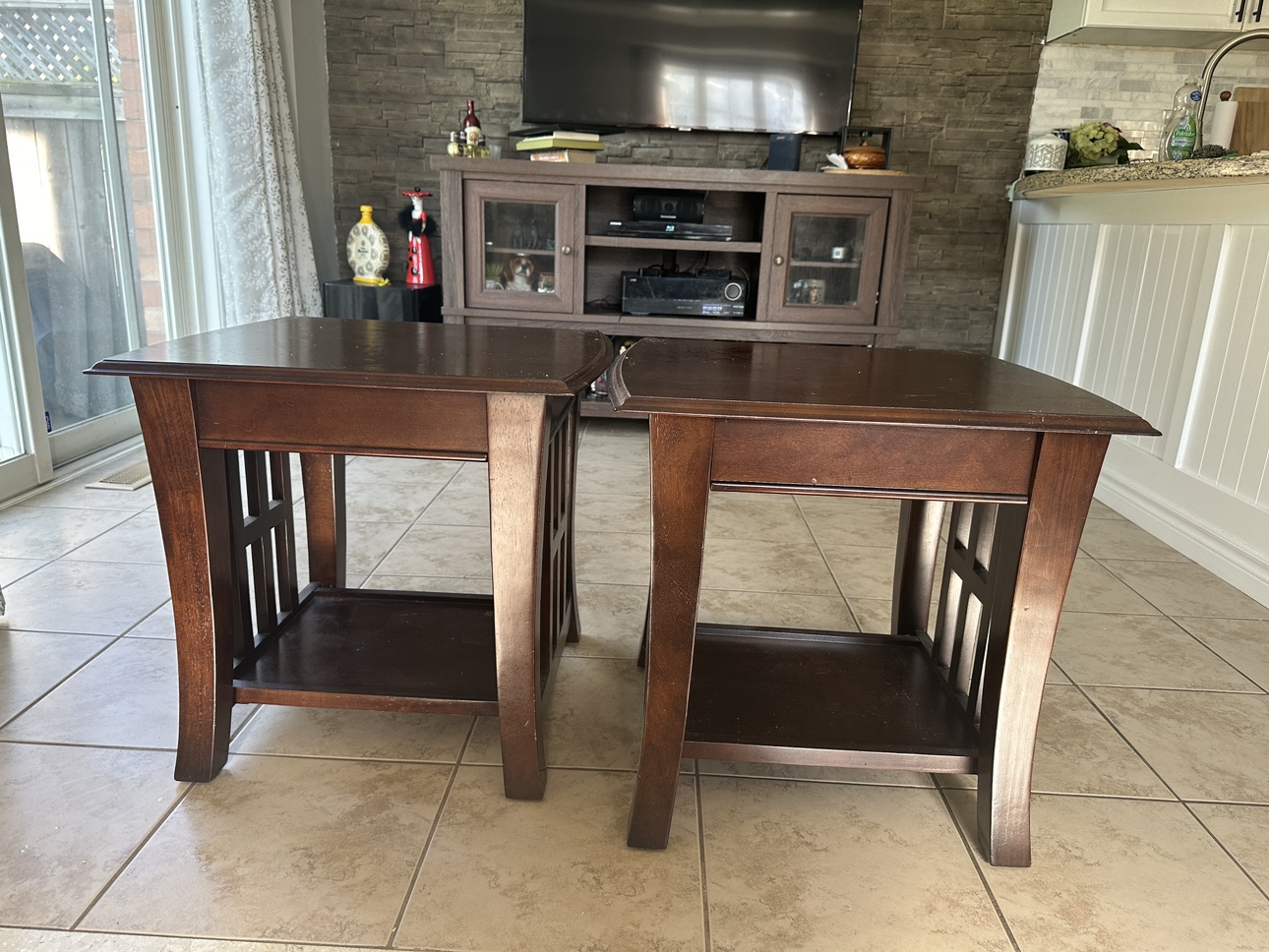Two end tables with a lower shelf. The tables are brown. They are in good condition. A large wicker basket is also included. It is light grey with two handles.