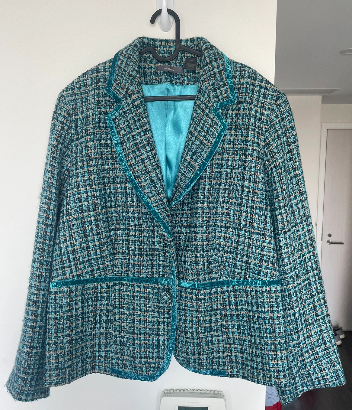 Liz Claiborne tweed jacket w/ teal velvet trim