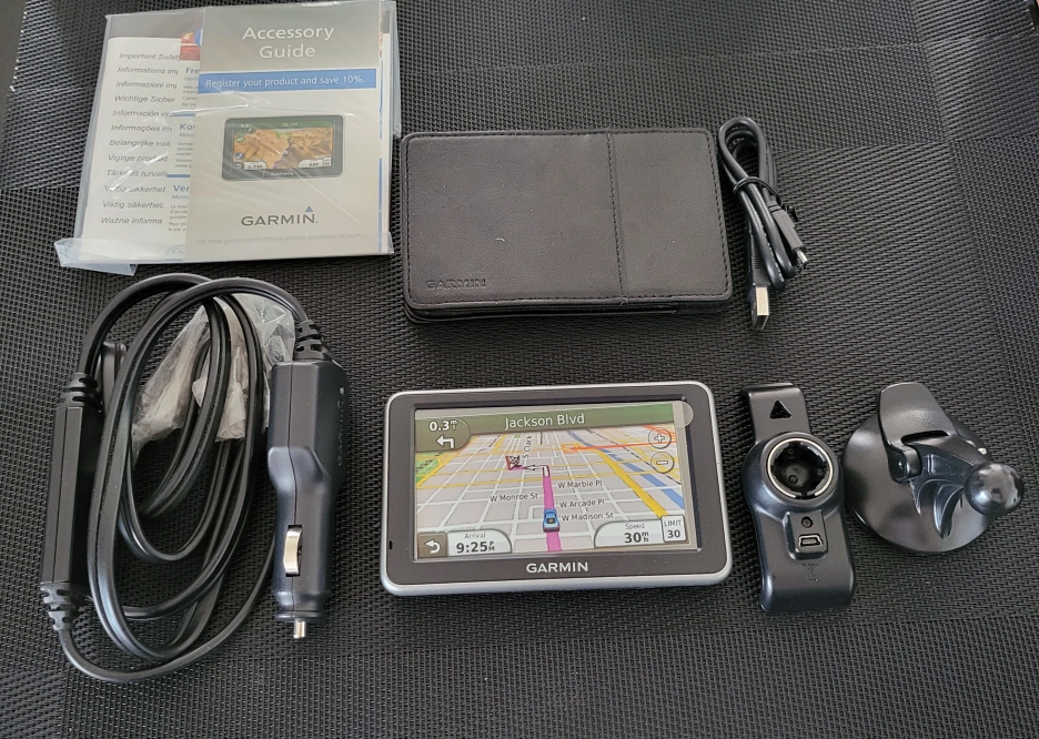 Includes vehicle suction cup mount, power cable, USB cable, quick start manual, leather pouch.