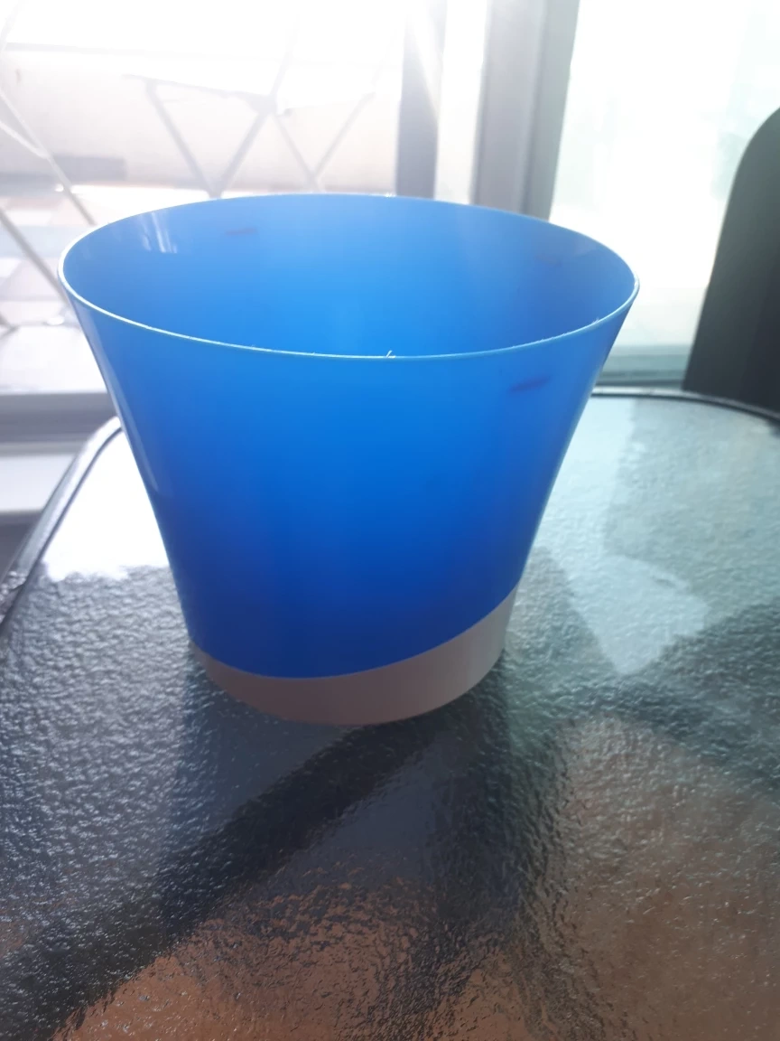 A blue plastic flower pot, 6.5 inches in diameter and 5.25 inches tall. The pot has drainage holes and a white base. It is suitable for a small plant. condition like new. I decluttering space and would like to give it away. please come and pick it up and enjoy your beautiful flowers in it. ๐น๐น๐น