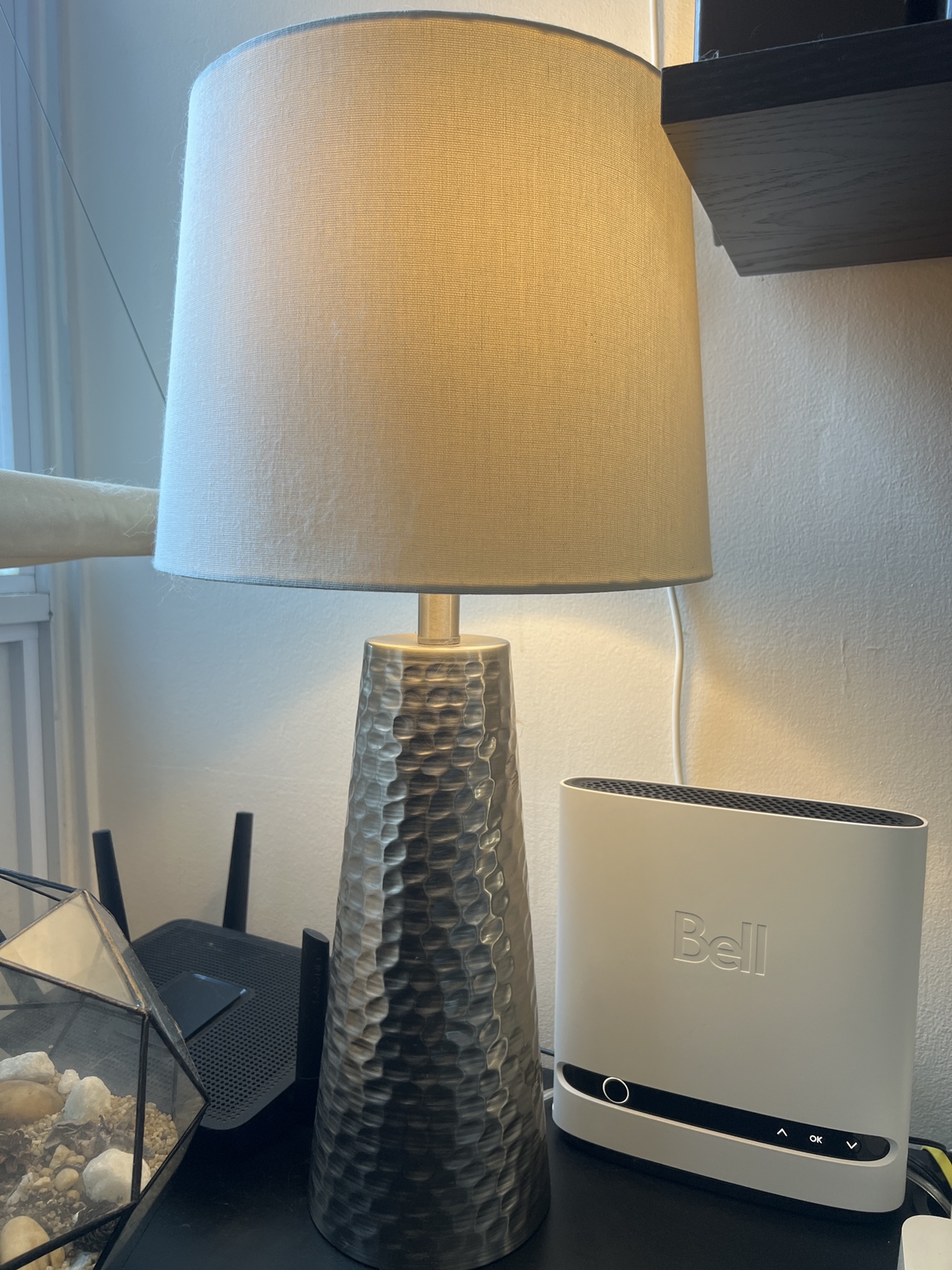 A beautiful table lamp with a hammered metal base and a white fabric shade. It would look great in any living room, bedroom, or office.