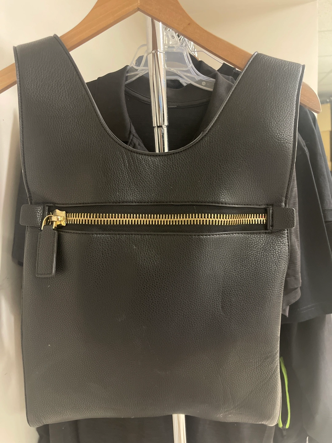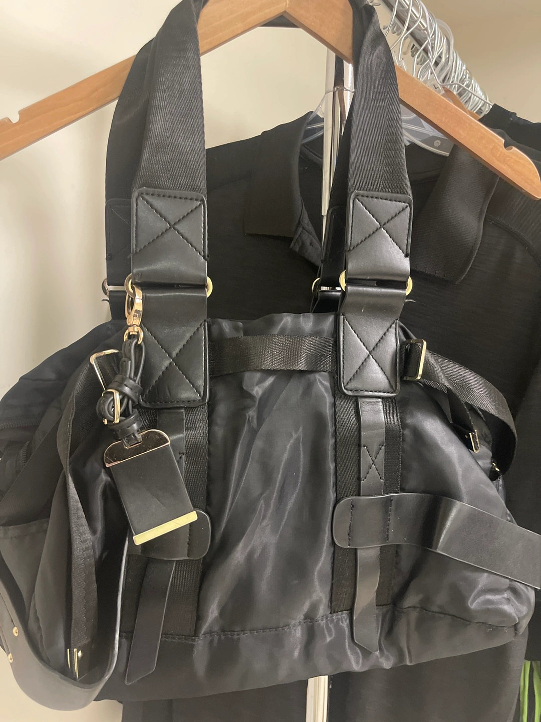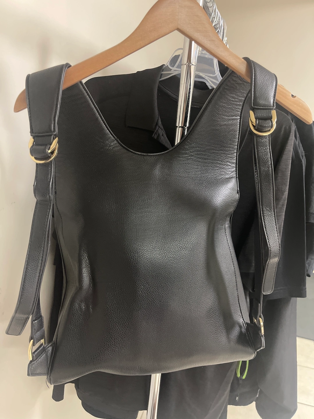 A black leather like backpack with big gold accents. It features a top zipper closure, a small pocket on the front, and adjustable straps and other 2 big pockets long straps purse with lots of room.