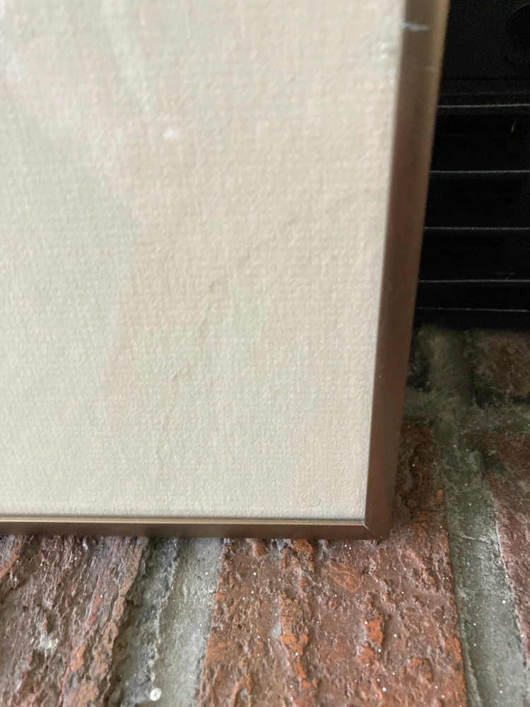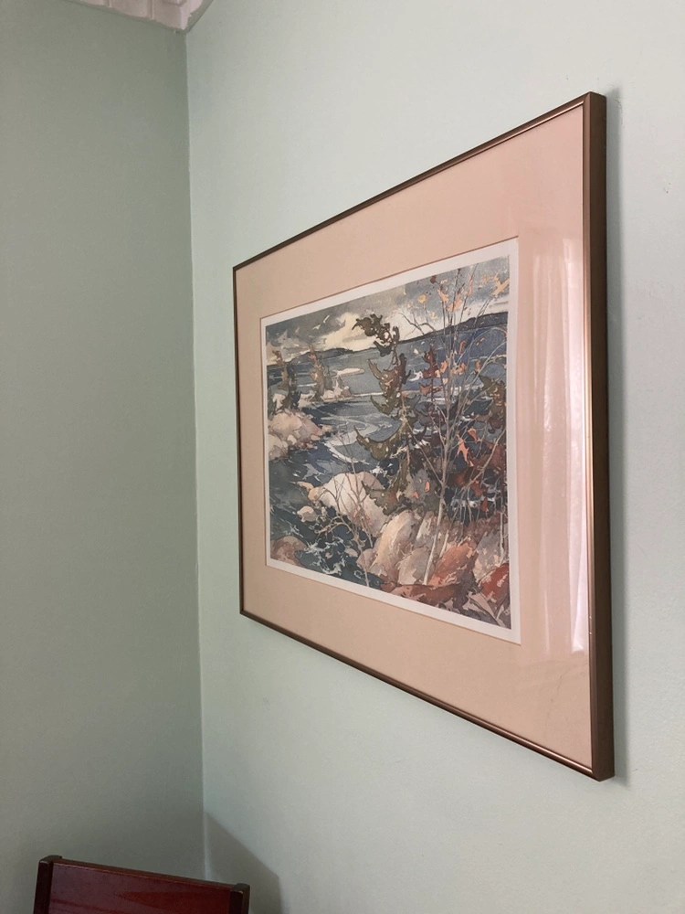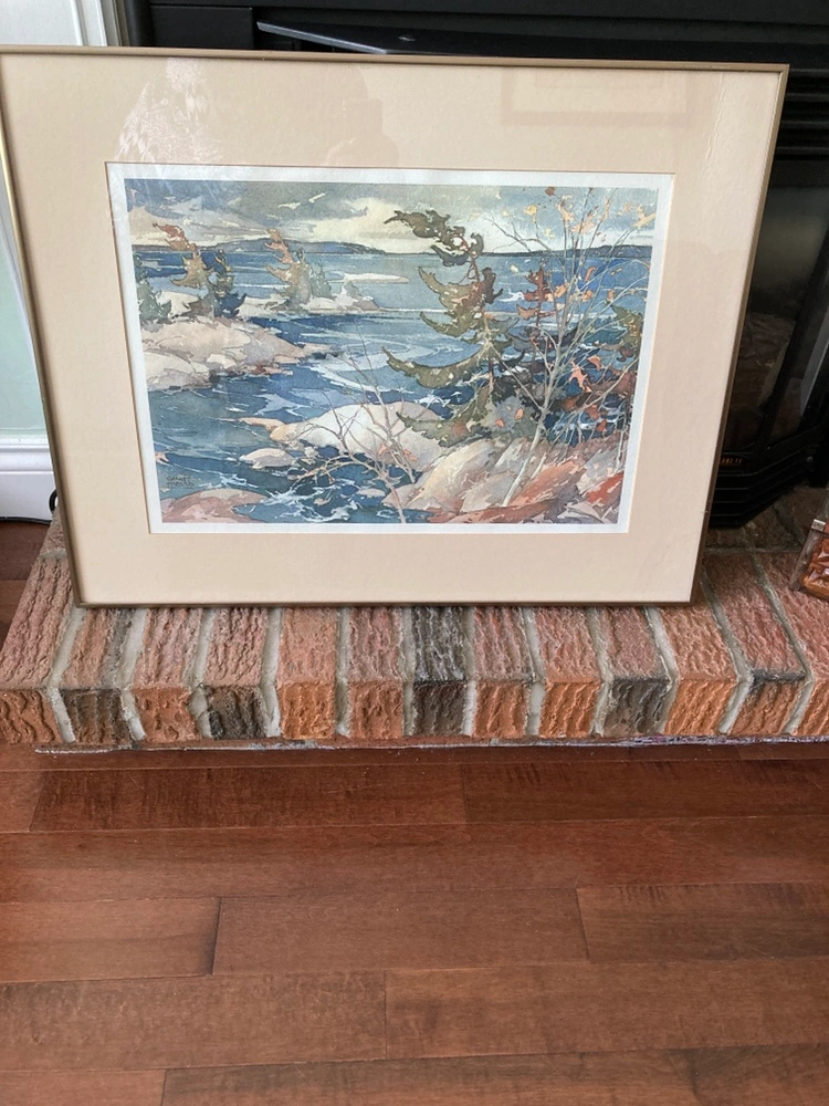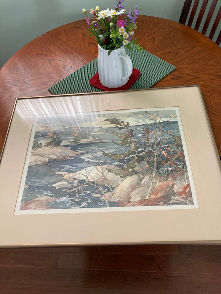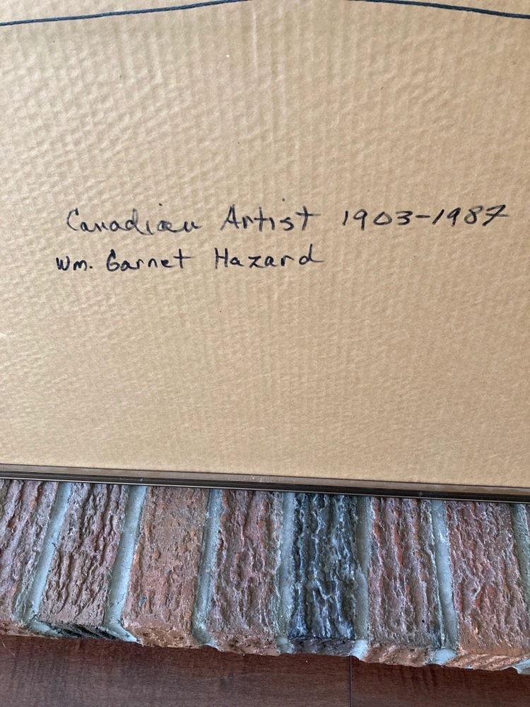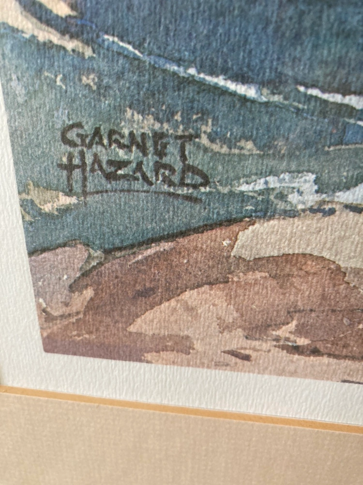 Framed watercolor painting by Canadian artist Wm. Garnet Hazard (1903-1987). The painting depicts a seascape with rocks and trees in the foreground and choppy water in the background. The painting is framed in a simple, gold-coloured frame. The piece measures approximately 20" x 26".