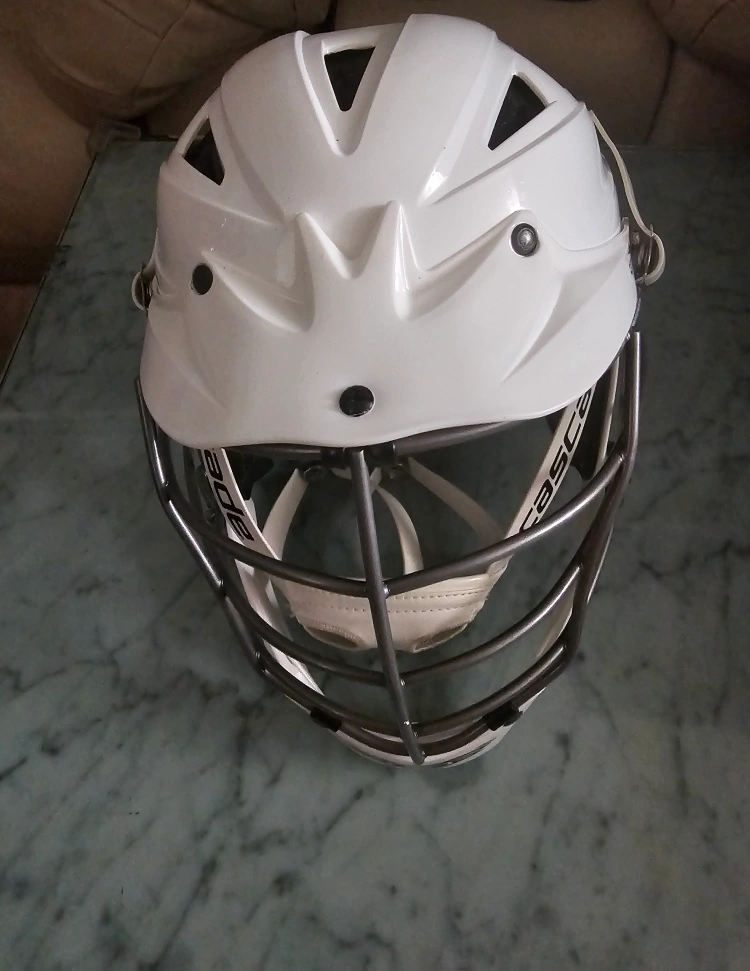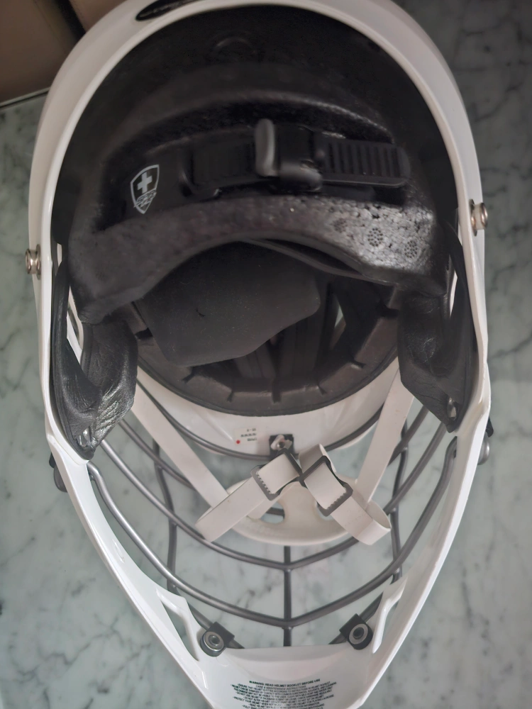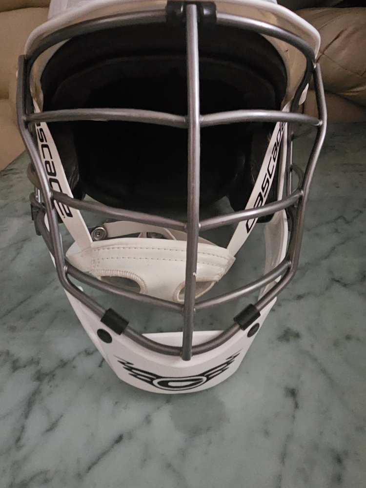 White Cascade CPV-R Lacrosse helmet with a gray cage. It comes with the chin strap and the helmet liner. It's a size XS.