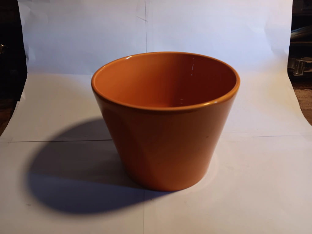 A medium-smalled sized, ceramic flower pot in burnt orange orange. No drainage. 10cm tall, 13cm diameter at brim. Green thumb not included.