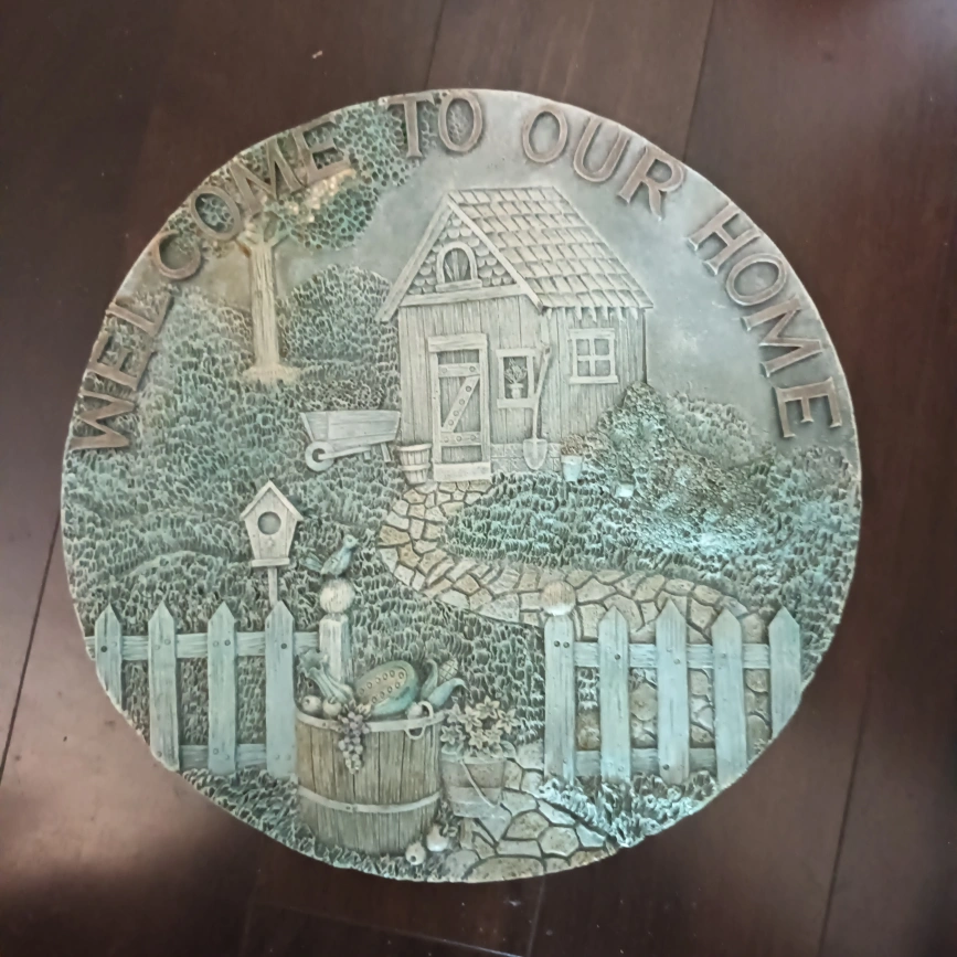 A decorative stone plaque featuring a garden scene with a small shed, birdhouse, fence, and a welcome sign. It is made of a textured material that is similar to concrete. It is round and measures approximately 12 inches in diameter.