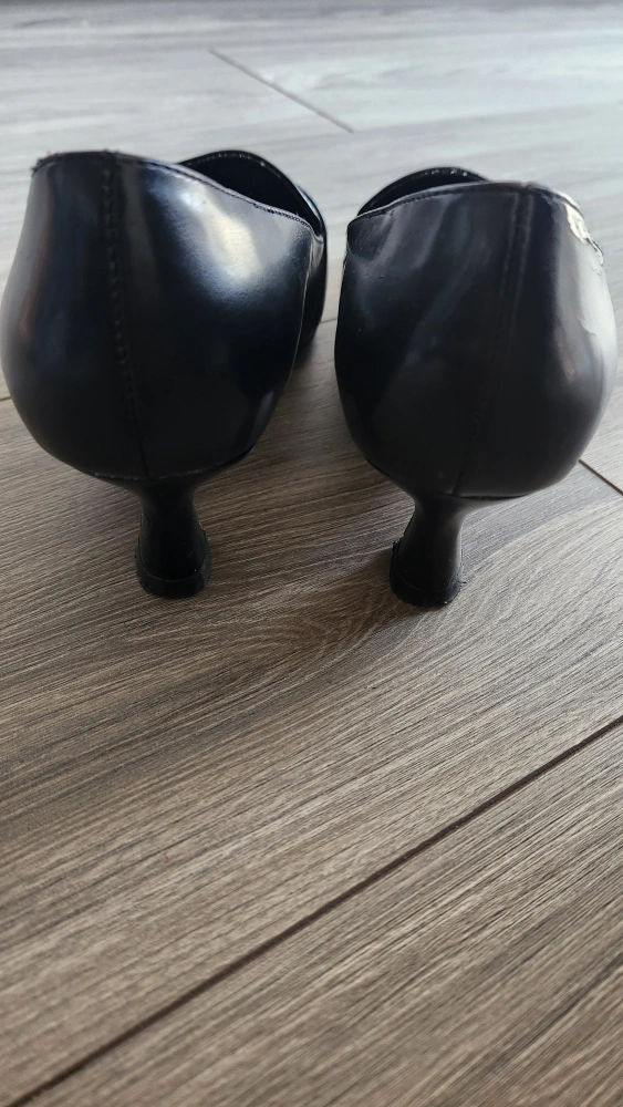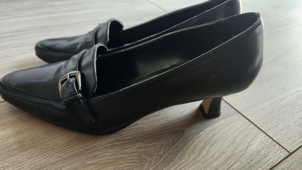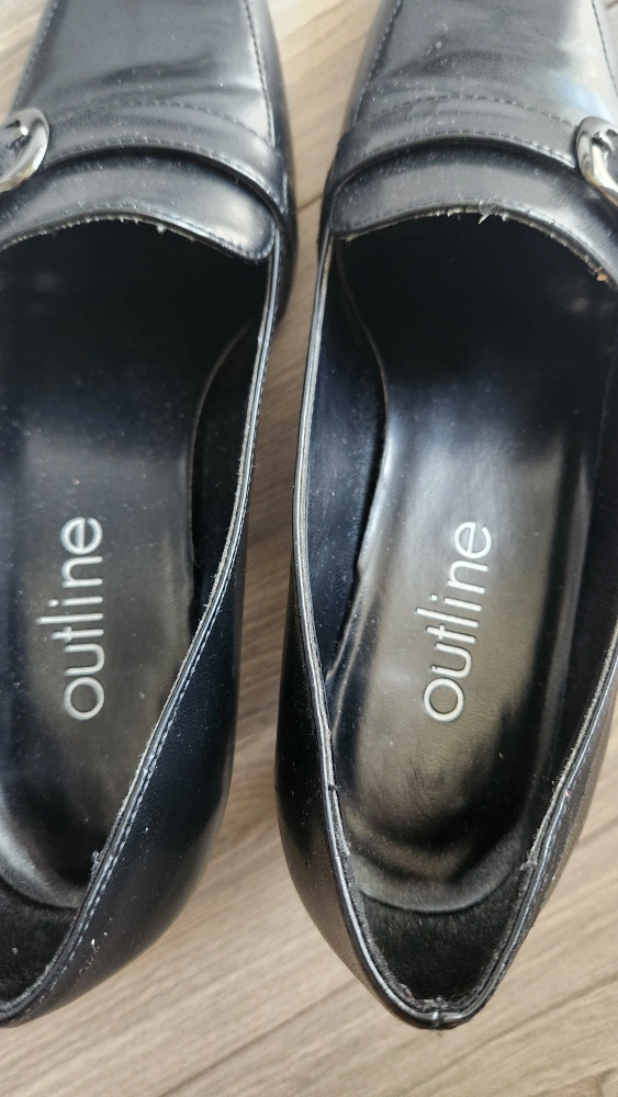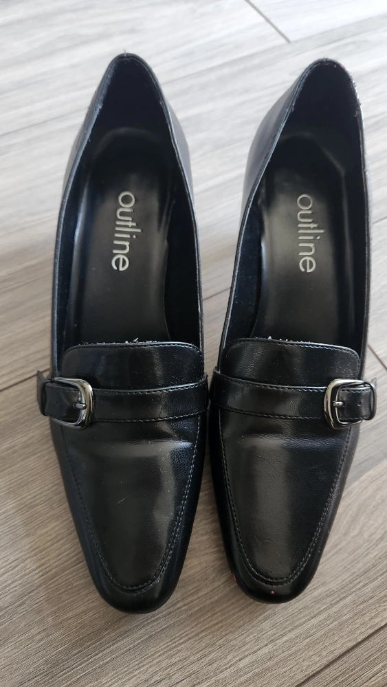These are black leather shoes with a buckle. The brand is Outline. They have a low heel. They are size 6