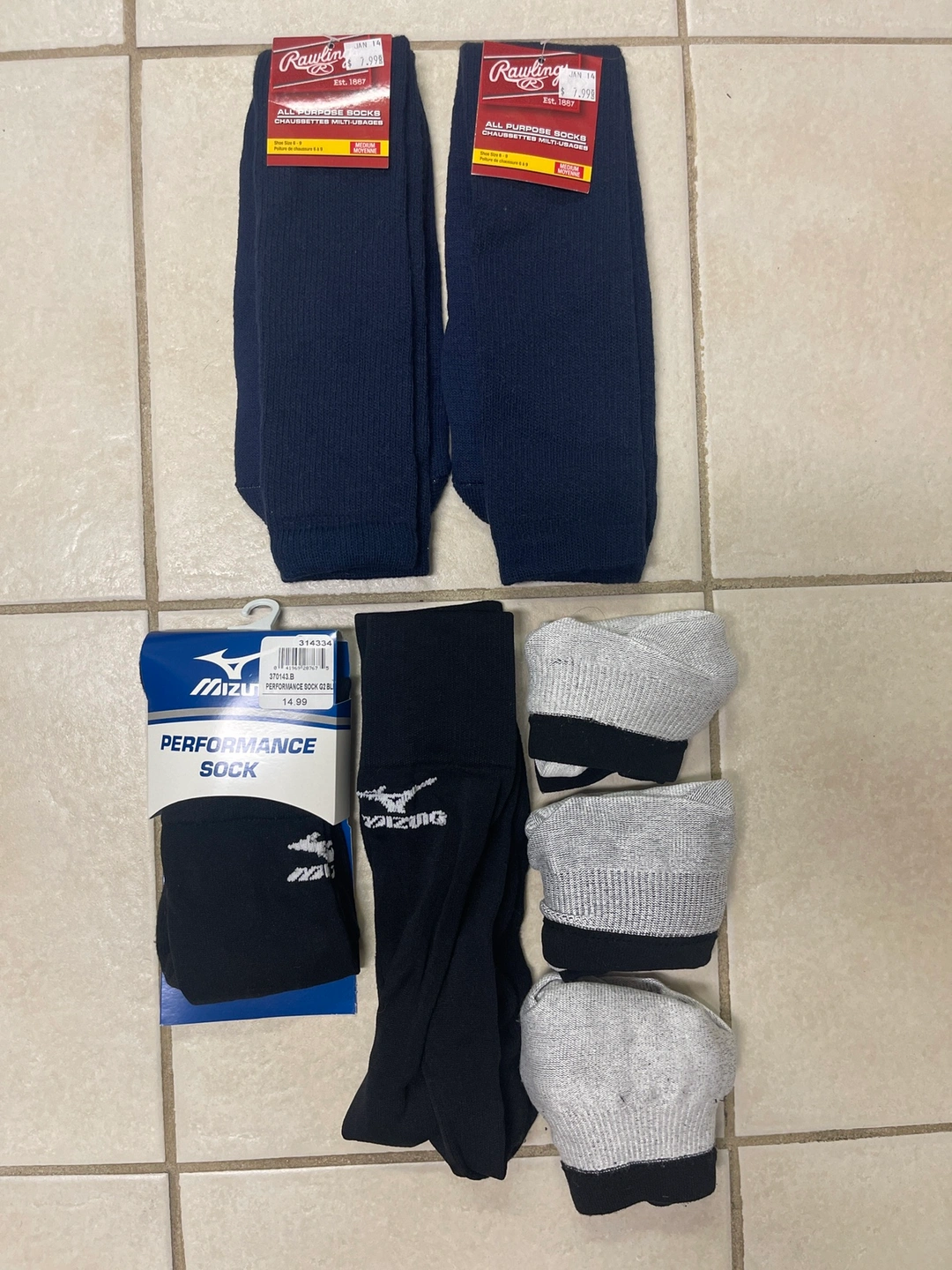 A bundle of 7 pairs of socks including Rawlings, Mizuno, and an unbranded pair. The Rawlings socks are blue and the Mizuno socks are black. The unbranded socks are grey. All of the socks are crew socks. There are two pairs of Rawlings socks, three pairs of Mizuno socks, and two pairs of the unbranded socks.