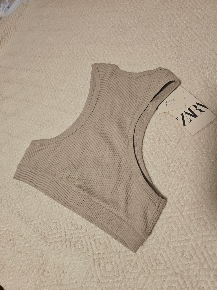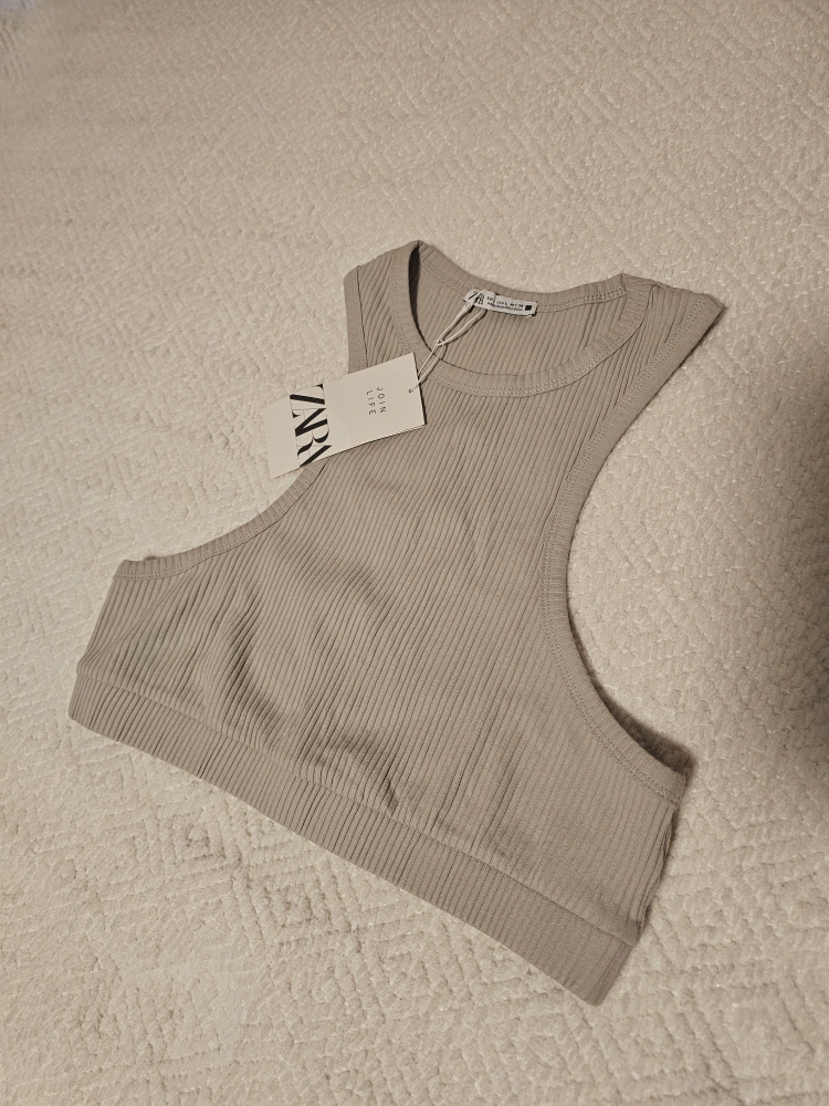 This is a sleeveless grey ribbed crop top from Zara. It has a crew neck and a racerback. The top is made from a stretchy, comfortable fabric. It is in perfect condition.