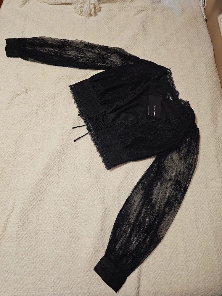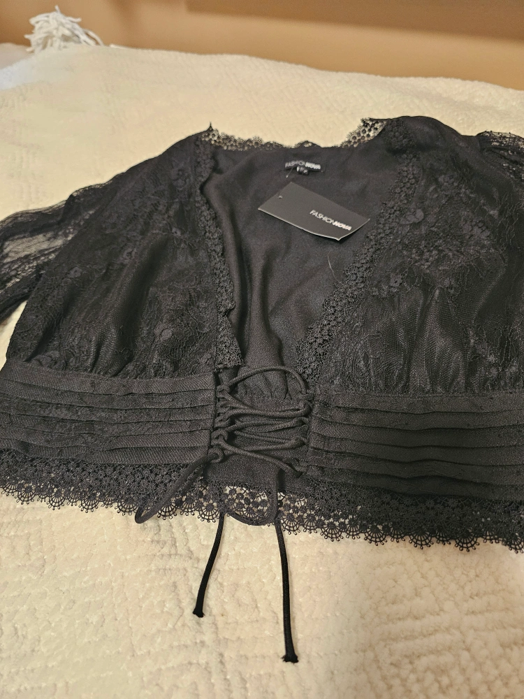 This top features a lace fabric, long sleeves, a v-neckline, and a lace trim. It has a lace-up detail at the front.