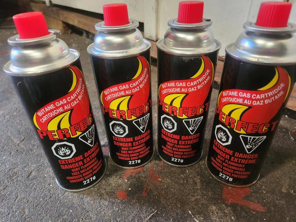 Four (4) brand new PERFECT Butane Gas Stove Cartridges. Each cartridge weighs 227g. Bought off Amazon, offering half price OBO