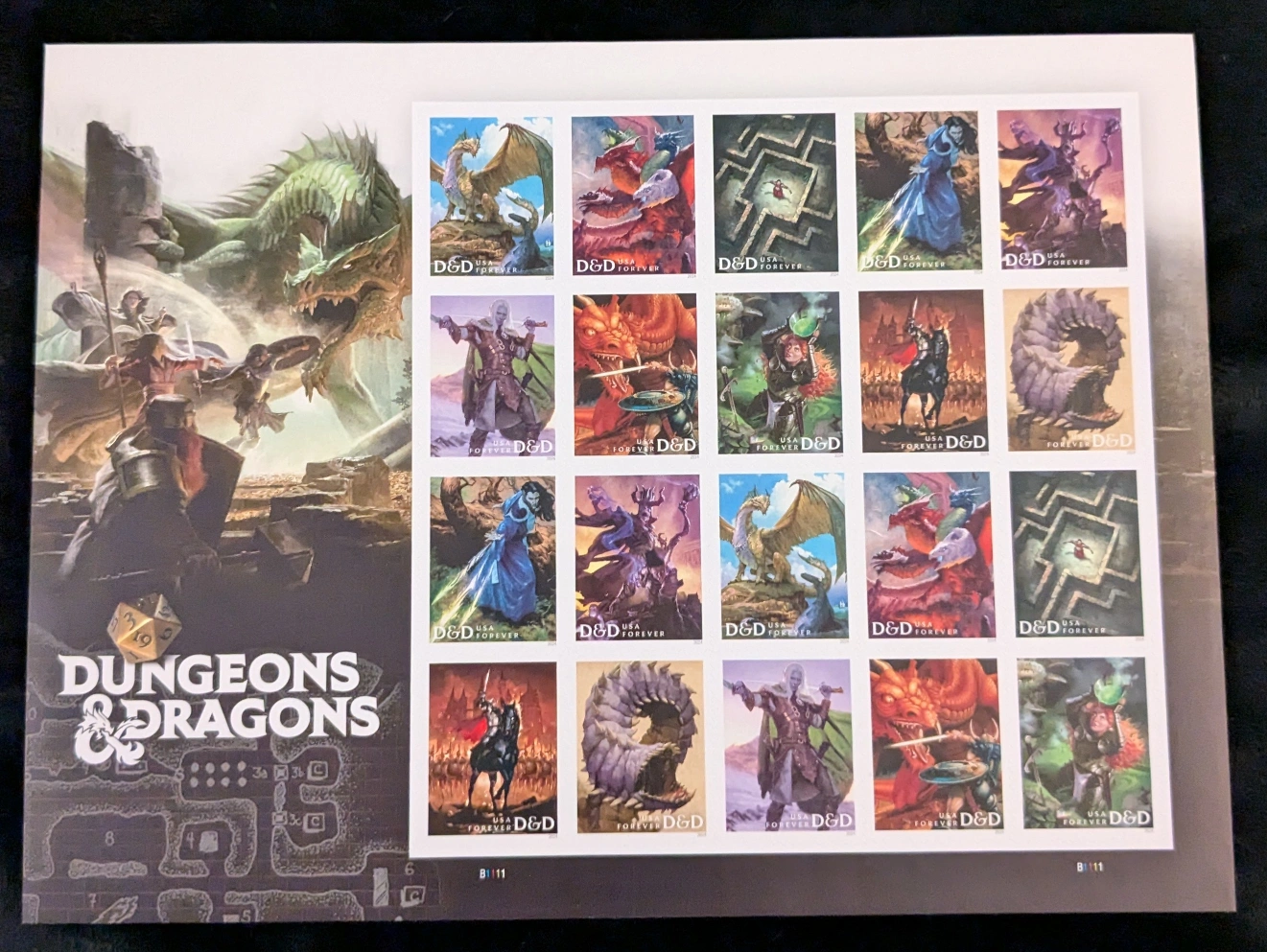 A sheet of 20 US postage stamps featuring various images from Dungeons & Dragons.