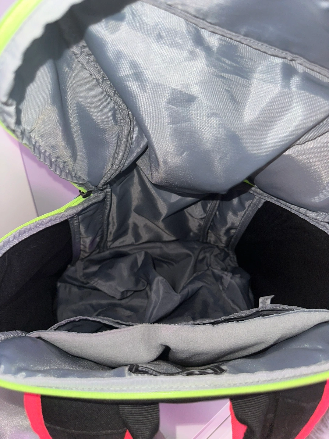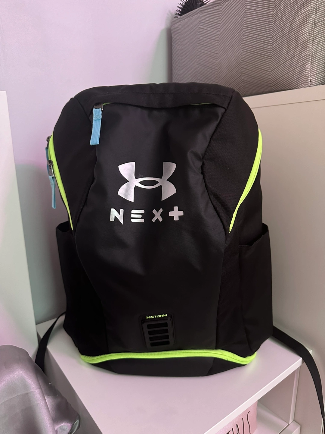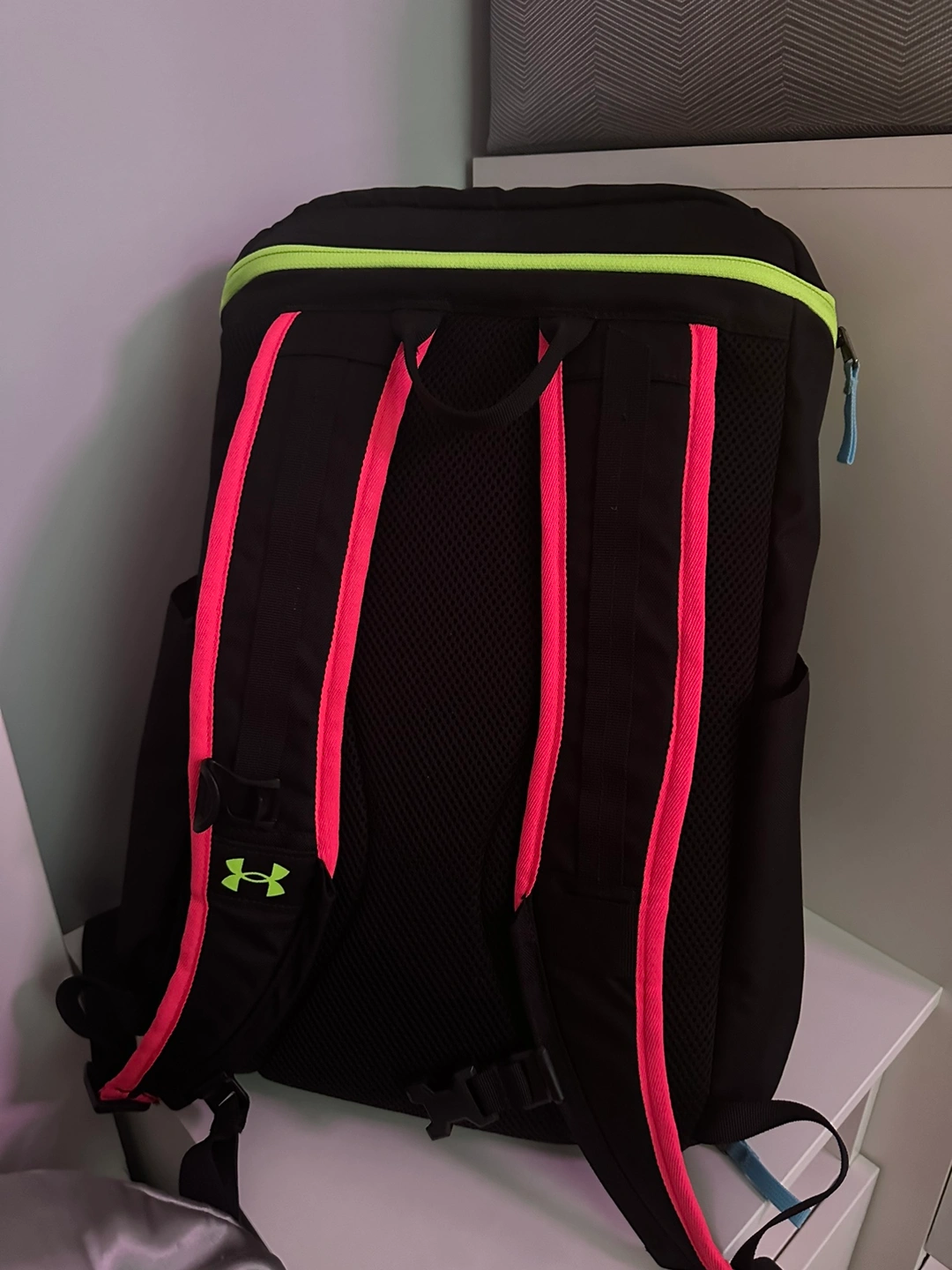 -Neon green accents and pink straps. It has a large main compartment, a laptop sleeve, and several smaller pockets. Features a large Under Armour logo on the front